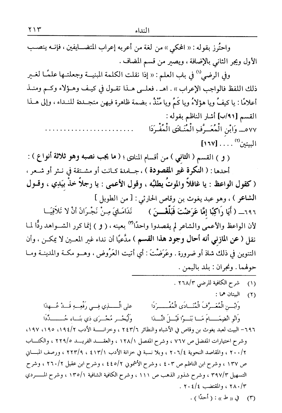لأن الواعظ والأعمى والشاعر لم يقصدوا واحدًا3 بعينه، "و" إنما كرر الشواهد ردًّا لما نقل "عن المازني أنه أحال وجود هذا القسم" مدعيًا أن نداء غير المعين لا يمكن، وأن التنوين في ذلك شاذ أو ضرورة، وعرضت: أي أتيت العروض، وهو مكة والمدينة وما حولهما، ونجران: بلد باليمن.