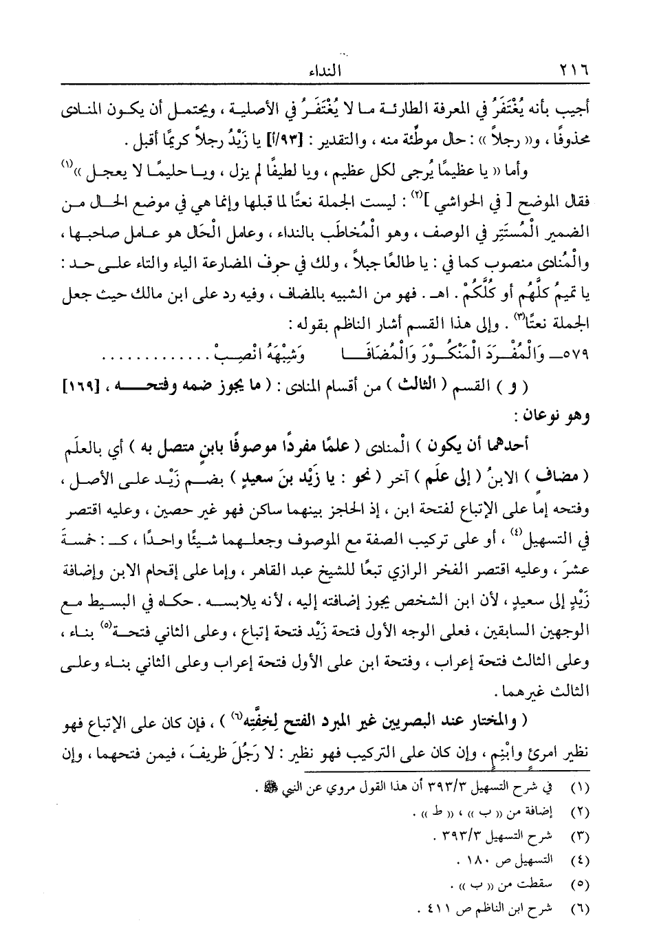 أحدهما أن يكون" المنادى "علمًا مفردًا موصوفًا بابن متصل به" أي بالعلم "مضاف" الابن "إلى علم" آخر "نحو: يا زيد بن سعيد" بضم زيد على الأصل، وفتحه إما على الإتباع لفتحة ابن، إذ الحاجز بينهما ساكن فهو غير حصين، وعليه اقتصر في التسهيل4، أو على تركيب الصفة مع الموصوف وجعلهما شيئًا واحدًا، كـ: خمسة عشر، وعليه اقتصر الفخر الرازي تبعًا للشيخ عبد القاهر، وإما على إقحام الابن وإضافة زيد إلى سعيد، لأن ابن الشخص يجوز إضافته إليه، لأنه يلابسه. حكاه في البسيط مع الوجهين السابقين، فعلى الوجه الأول فتحة زيد فتحة إتباع، وعلى الثاني فتحة5 بناء، وعلى الثالث فتحة إعراب، وفتحة ابن على الأول فتحة إعراب وعلى الثاني بناء وعلى الثالث غيرهما.