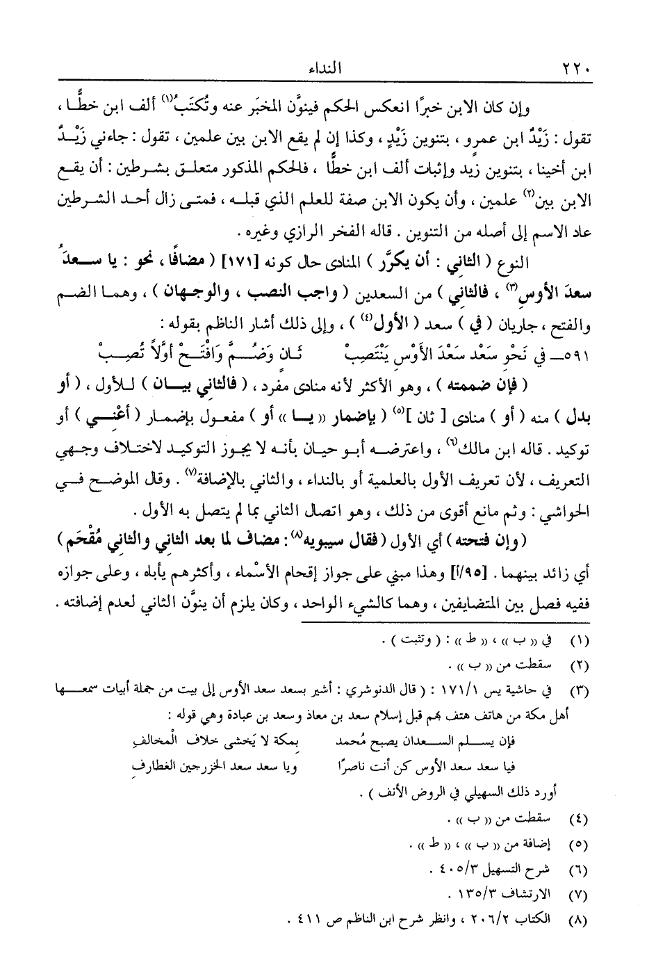 النوع "الثاني: أن يكرر" المنادى حال كونه "مضافًا، نحو: يا سعدَُ سعدَ الأوس3، فالثاني" من السعدين "واجب النصب، والوجهان"، وهما الضم والفتح، جاريان "في" سعد "الأول4"، وإلى ذلك أشار الناظم بقوله: