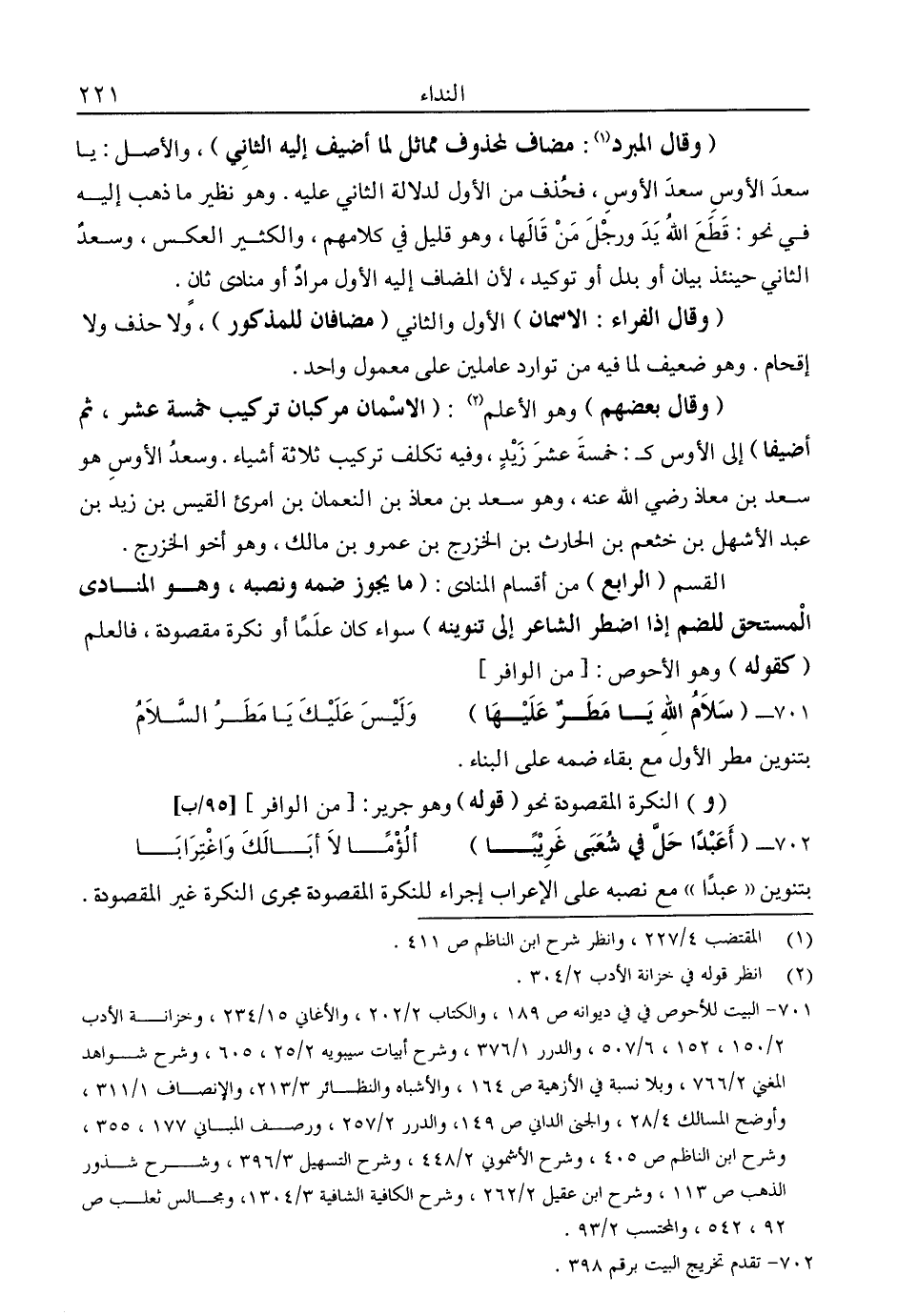 القسم "الرابع" من أقسام المنادى: "ما يجوز ضمه ونصبه، وهو المنادى المستحق للضم إذا اضطر الشاعر إلى تنوينه" سواء كان علمًا أو نكرة مقصودة، فالعلم "كقوله" وهو الأحوص: [من الوافر]