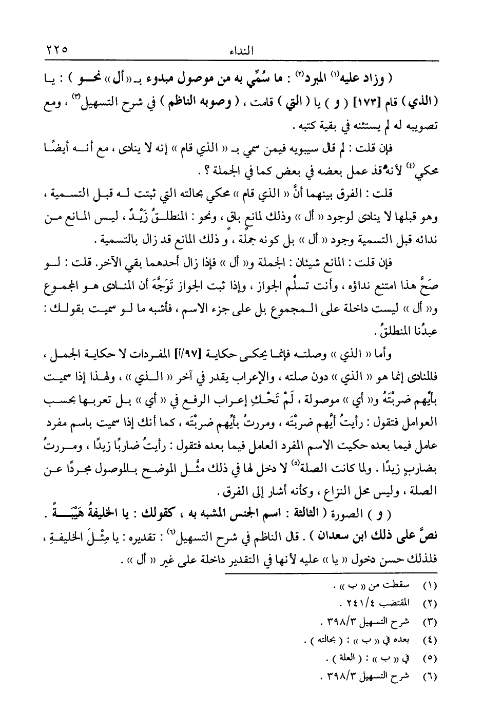 "وزاد عليه1 المبرد2: ما سمي به من موصول مبدوء بـ"أل" نحو": يا "الذي" قام "و" يا "التي" قامت، "وصوبه الناظم" في شرح التسهيل3، مع تصويبه له لم يستثنه في بقية كتبه.