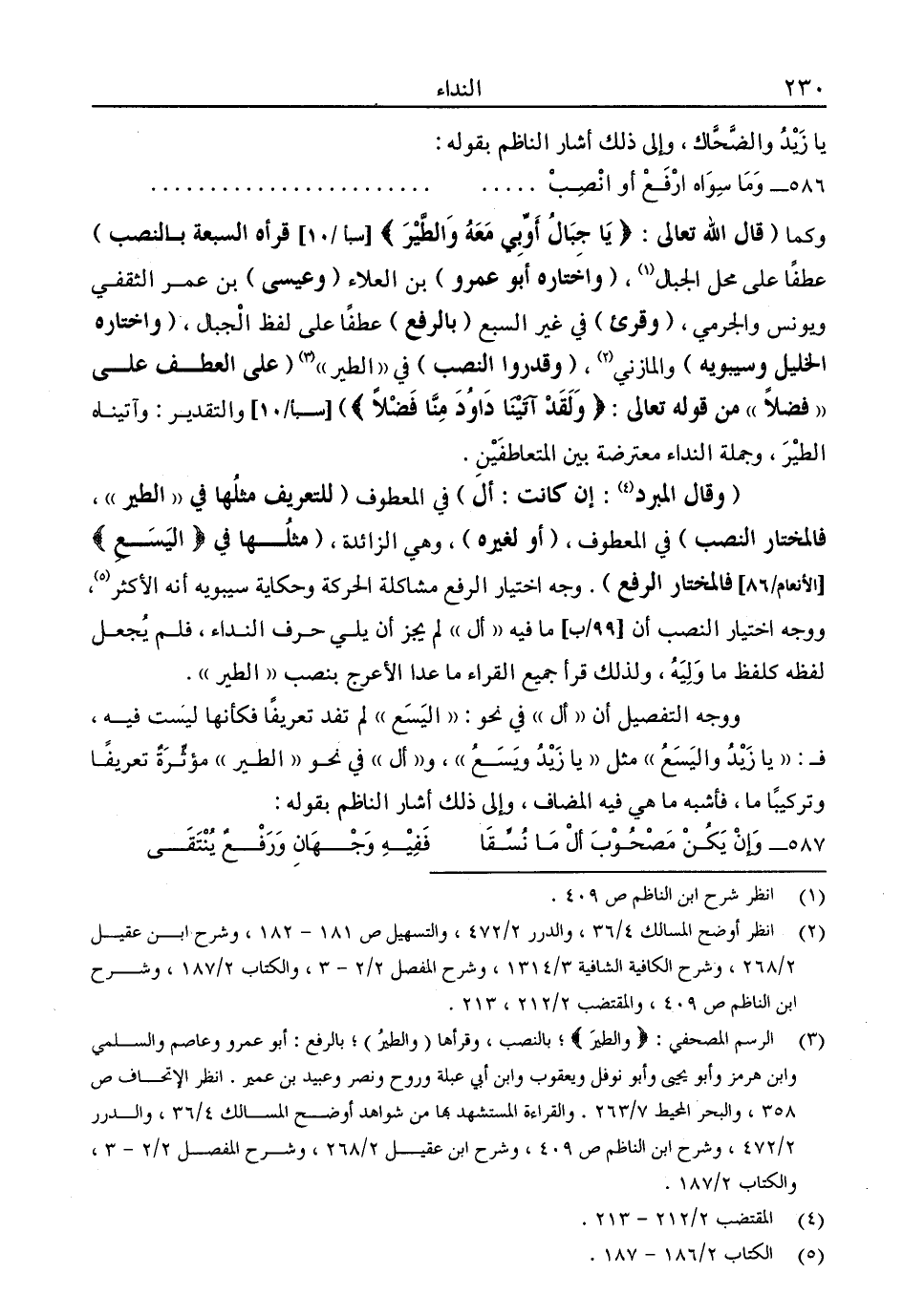 "وقال المبرد4: إن كانت: أل" في المعطوف "للتعريف مثلها في "الطير"، فالمختار النصب" في المعطوف، "أو لغيره"، وهي الزائدة "مثلها في {الْيَسَعَ} [الأنعام: 86] فالمختار الرفع". وجه اختيار الرفع مشاكلة الحركة وحكاية سيبويه أنه أكثر5، ووجه اختيار النصب أن ما فيه "أل" لم يجز أن يلي حرف النداء، فلم يجعل لفظه كلفظ ما وليه، ولذلك قرأ جميع القراء ما عدا الأعرج بنصب "الطير".