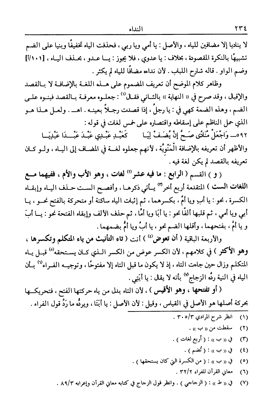 لا يناديا إلا مضافين للياء، والأصل: يا أمي ويا ربي، فحذفت الياء تخفيفا وبنيا على الضم تشبيها بالنكرة المقصودة، بخلاف: يا عدوي، فلا يجوز: يا عدو، بحذف الياء، وضم الواو. قاله شارح اللباب، لأن نداءه مضافًا للياء لم يكثر.