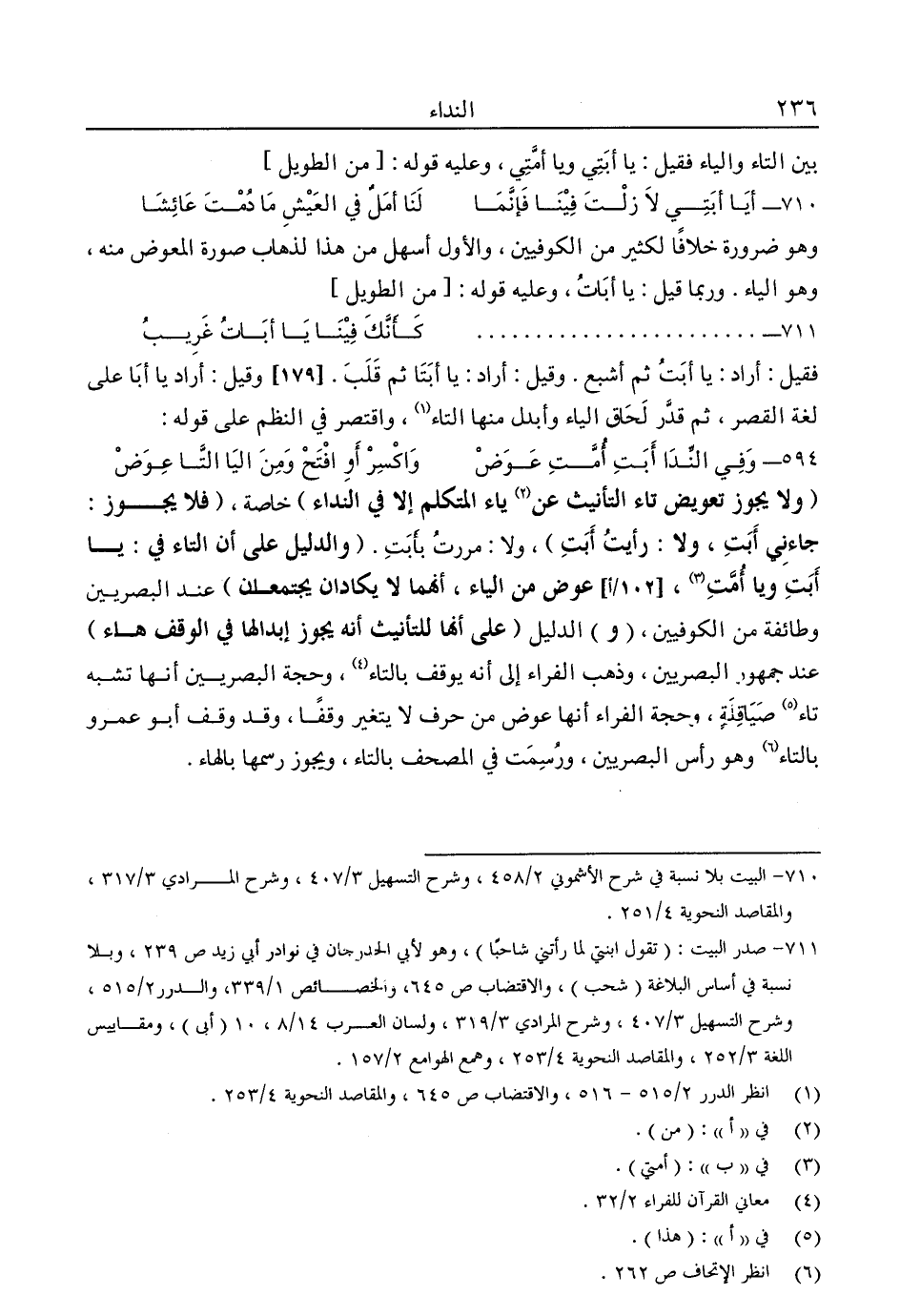"ولا يجوز تعويض تاء التأنيث عن2 ياء المتكلم إلا في النداء" خاصة، "فلا يجوز: جاءني أبت، ولا: رأيت أبت". ولا: مررت بأبت. "والدليل على أن التاء في: يا أبت ويا أمت3، عوض من الياء، أنهما لا يكادان يجتمعان" عند البصريين وطائفة من الكوفيين، "و" الدليل "على أنها للتأنيث أنه يجوز إبدالها في الوقف هاء" عند جمهور البصريين، وذهب الفراء إلى أنه يوقف التاء4، وحجة البصريين أنها تشبه تاء5 صياقلة، وحجة الفراء أنها عوض من حرف لا يتغير وقفًا، وقد وقف أبو عمرو بالتاء6 وهو رأس البصريين، ورسمت في المصحف بالتاء، ويجوز رسمها بالهاء.