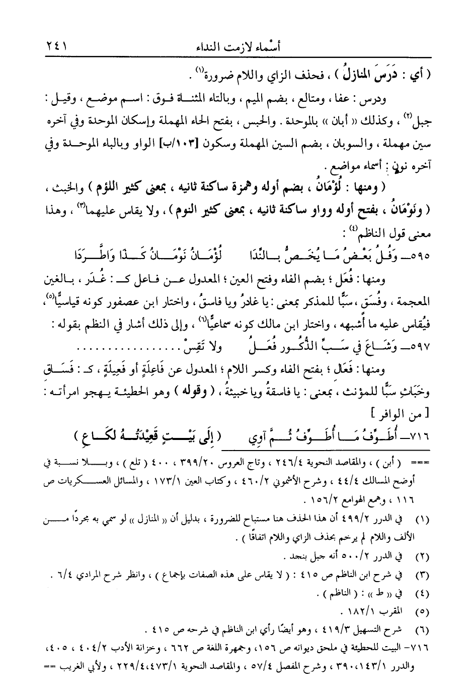 1 في الدرر 2/ 499، أن هذا الحذف هنا مستباح للضرورة، بدليل أن "المنازل" لو سمي به مجردًا من الألف واللام لم يرخم بحذف الزاي واللام اتفاقًا.