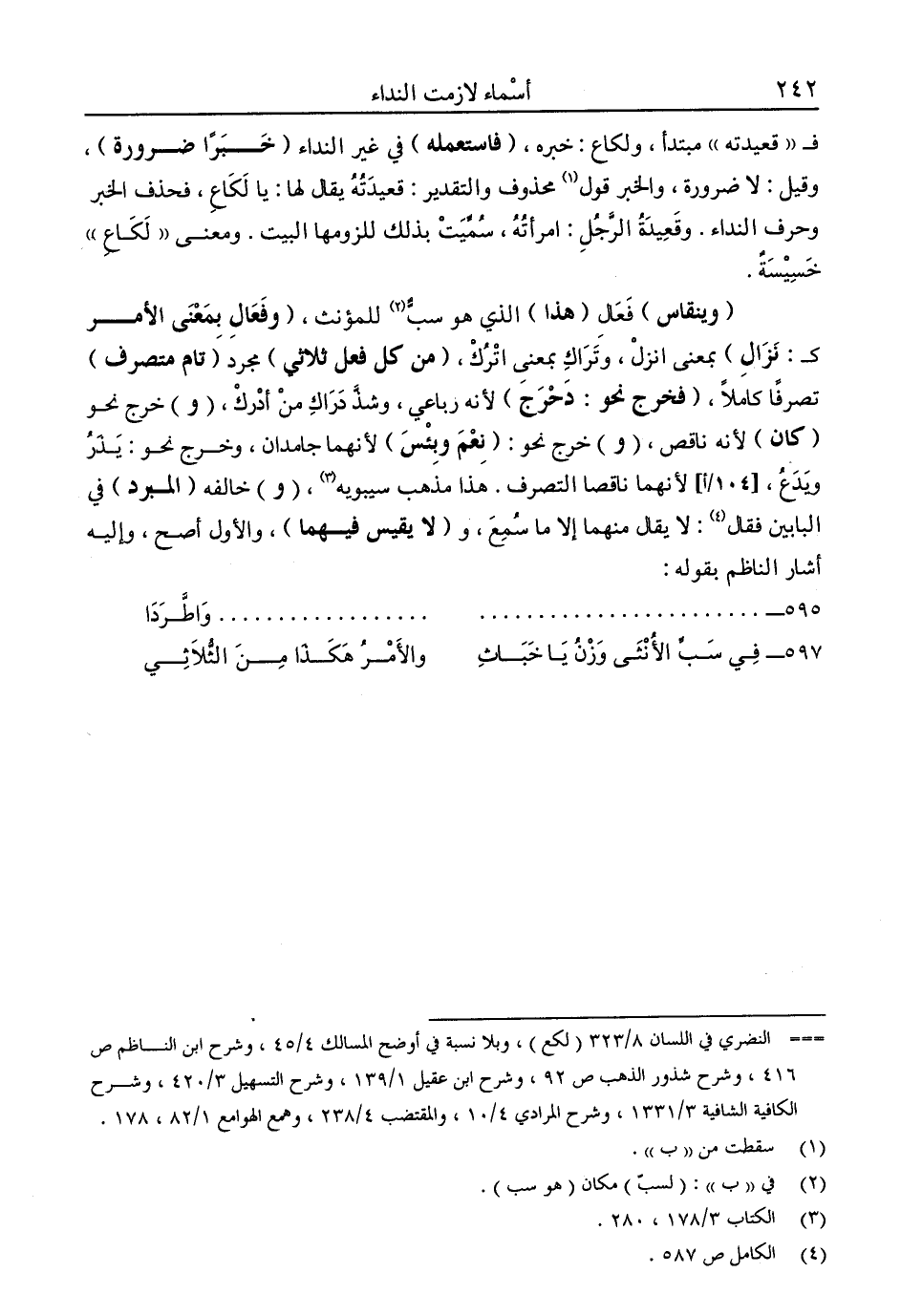 فـ"قعيدته" مبتدأ، ولكاع: خبره، "فاستعمله" في غير النداء "خبرا ضرورة"، وقيل: لا ضرورة، والخبر قول1 محذوف والتقدير: قعيدته يقال لها: يا لكاع، فحذف الخبر وحرف النداء. وقعيدة الرجل: امرأته، سميت بذلك للزومها البيت. ومعنى "لكاع" خسيسة.