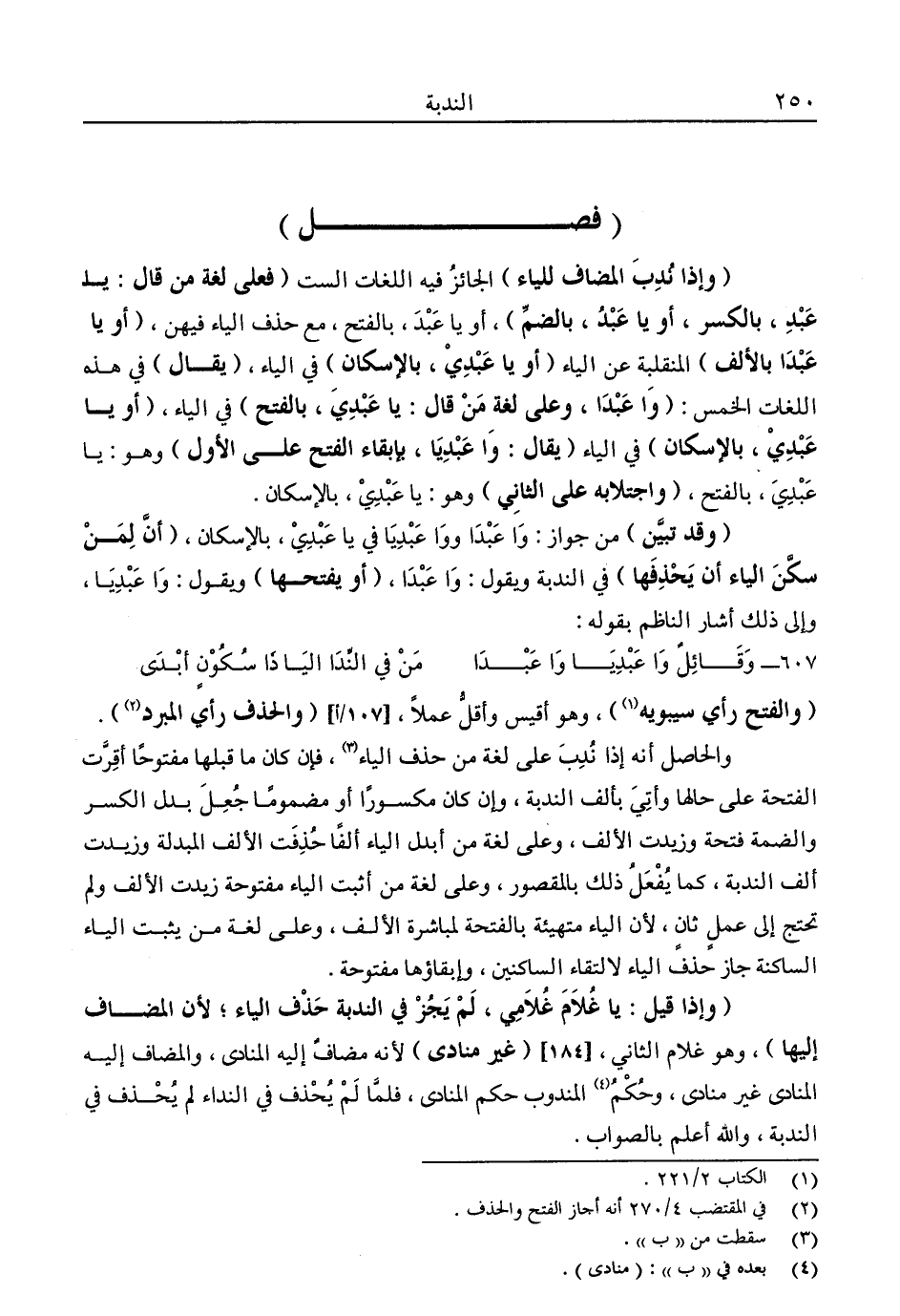 والحاصل أنه إذا ندب على لغة من حذف الياء3، فإن كان ما قبلها مفتوحًا أقرت الفتحة على حالها وأتي بألف الندبة، وإن كان مكسورًا أو مضموما جعل بدل الكسر والضمة فتحة وزيدت الألف، وعلى لغة من أبدل ألفًا حذفت الألف المبدلة وزيدت ألف الندبة، كما يفعل ذلك بالمقصور، وعلى لغة من أثبت الياء مفتوحة زيدت الألف ولم تحتج إلى عمل ثان، لأن الياء متهيئة بالفتحة لمباشرة الألف. وعلى لغة من يثبت الياء الساكنة جاز حذف الياء لالتقاء الساكين، وإبقاؤها مفتوحة.
