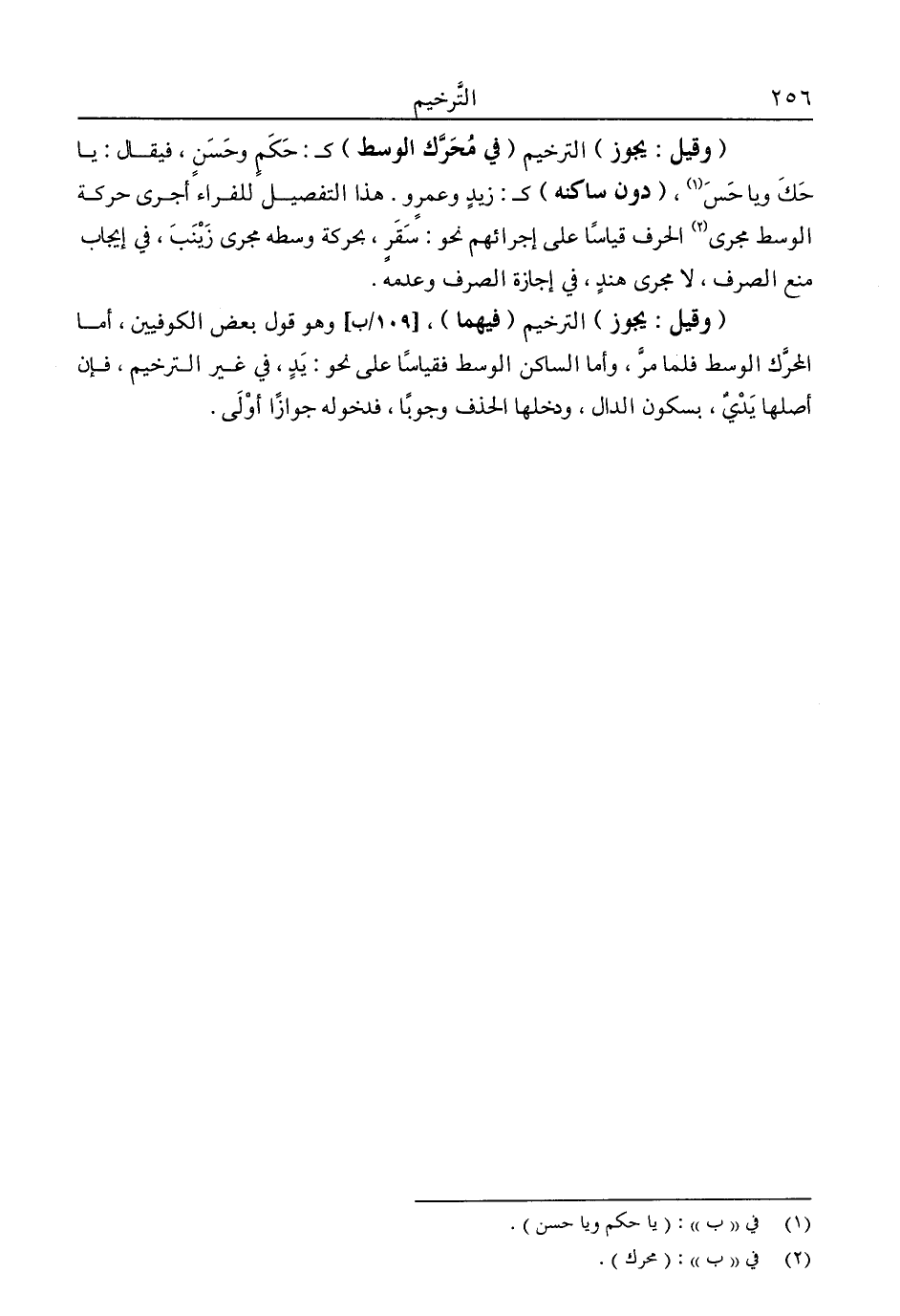 "وقيل: يجوز" الترخيم "في محرك الوسط" كـ: حكم وحسن، فيقال: يا حك ويا حس1. "دون ساكنه" كـ: زيد وعمرو. هذا التفصيل للفراء أجرى حركة الوسط مجرى2 الحرف قياسًا على إجرائهم نحو: سقر، بحركة وسطه مجرى زينب، في إيجاب منع الصرف، لا مجرى هند، في إجازة الصرف وعدمه.