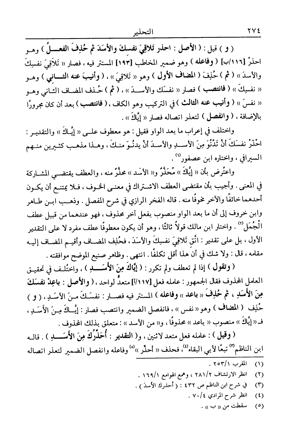 واختلف في إعراب ما بعد الواو فقيل: هو معطوف على "إياك" والتقدير: احذر نفسك أن تدنو من الأسد والأسد أن يدنو منك، وهذا مذهب كثيرين منهم السيرافي. واختاره ابن عصفور1.