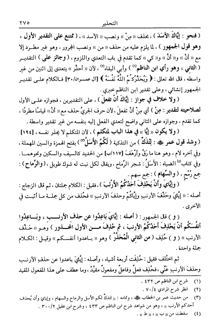 "ولا يكون "إيا" في هذا الباب لمتكلم"، لأن المتكلم لا يحذر نفسه، "وشذ قول عمر -رضي الله عنه: لتذك" من التذكية "لكم الأسل"3 بفتح الهمزة والسين المهملة، وفي آخر لام، وهو هنا ما رق وأرهف من الحديد كالسيف والسكين ونحوهما. وفي كتاب4 الضياء: الأسل: شجر الرماح، ويقال لكل نبت له شوك طويل، "والرماح": جمع رمح، "والسهام": جمع سهم.
