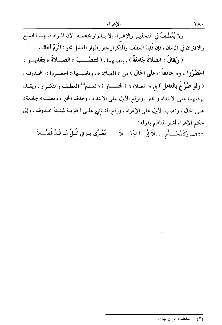 "ويقال: الصلاة جامعة"، بنصبهما، "فتنصب "الصلاة" بتقدير: احضروا و"جامعة" على الحال" من "الصلاة"، وناصبها "احضروا" المحذوف، "ولو صرح بالعامل" في "الصلاة" "لجاز"؛ لعدم1 العطف والتكرار. ويقال برفعهما على الابتداء والخبر، ويرفع الأول على الابتداء، ,حذف الخبر، ونصب "جامعة" على الحال، ونصب الأول على الإغراء، ورفع الثاني على الخبرية لمبتدأ محذوف. وإلى حكم الإغراء أشار الناظم بقوله: