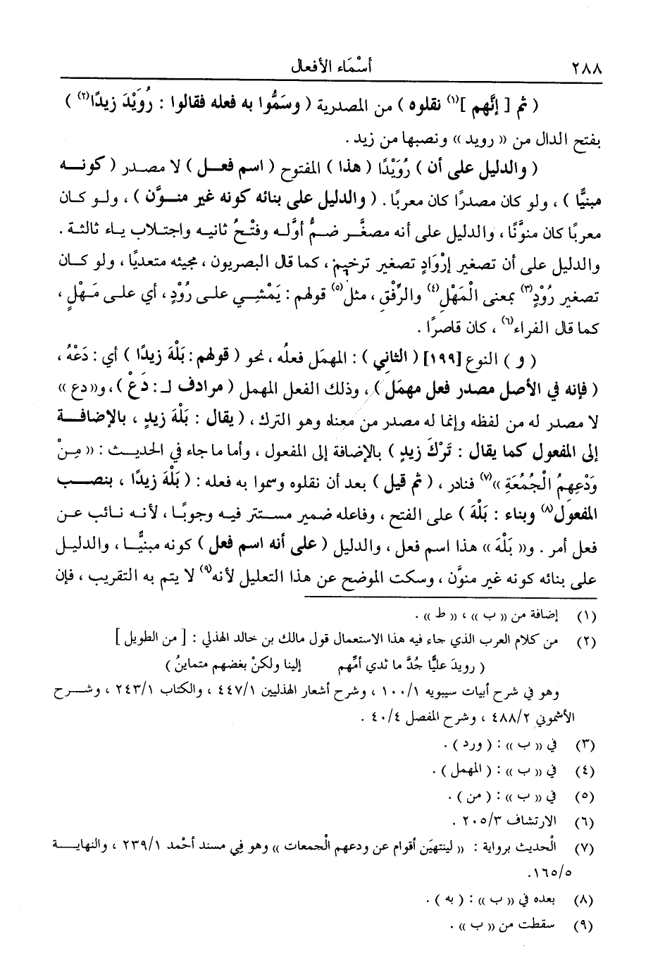 "والدليل على أن" رويدًا "هذا" المفتوح "اسم فعل" لا مصدر "كونه مبنيًا"، ولو كان مصدرًا كان معربًا. "والدليل على بنائه كونه غير منون"، ولو كان معربًا كان منونًا، والدليل على أنه مصغر ضم أوله وفتح ثانيه واجتلاب ياء ثالثة، والدليل على أن تصغير إرواد تصغير ترخيم، كما قال البصريون، مجيئه متعديًا، ولو كان تصغير رود3 بمعنى المهل4 والرفق، مثل5 قولهم: يمشي على رود، أي على مهل، كما قال الفراء6، كان قاصرًا.