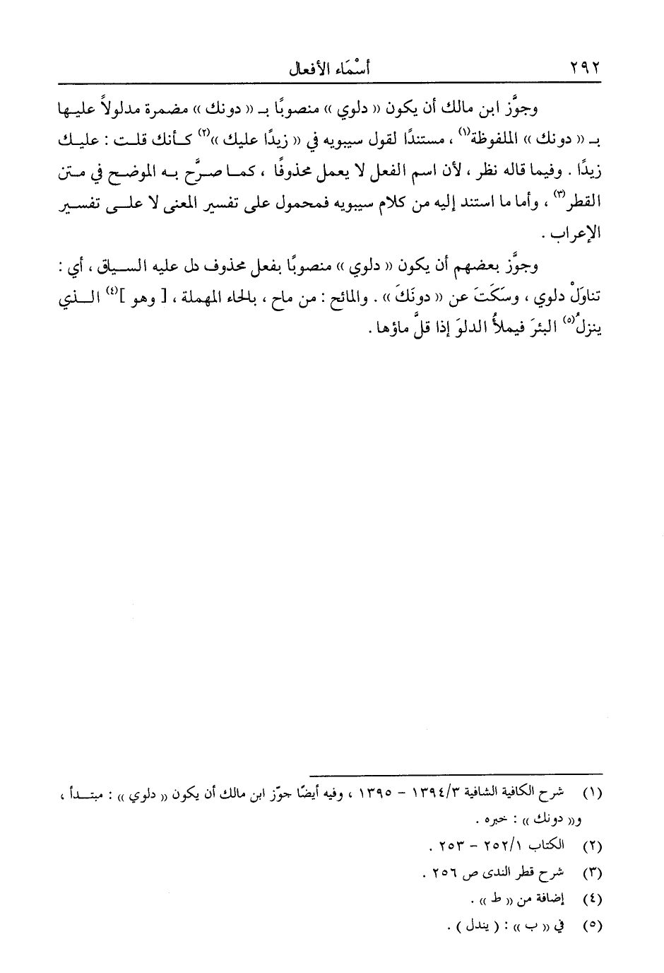 وجوز ابن مالك أن يكون "دلوي" منصوبًا بـ"دونك" مضمرة مدلولا عليها بـ"دونك" الملفوظة1، مستندًا لقول سيبويه في "زيدًا عليك"2 كأنك قلت: عليك زيدًا. وفيما قاله نظر، لأن اسم الفعل لا يعمل محذوفًا، كما صرح به الموضح في متن القطر3. وأما ما استند إليه من كلام سيبويه فمحمول على تفسير المعنى لا على تفسير الإعراب؟