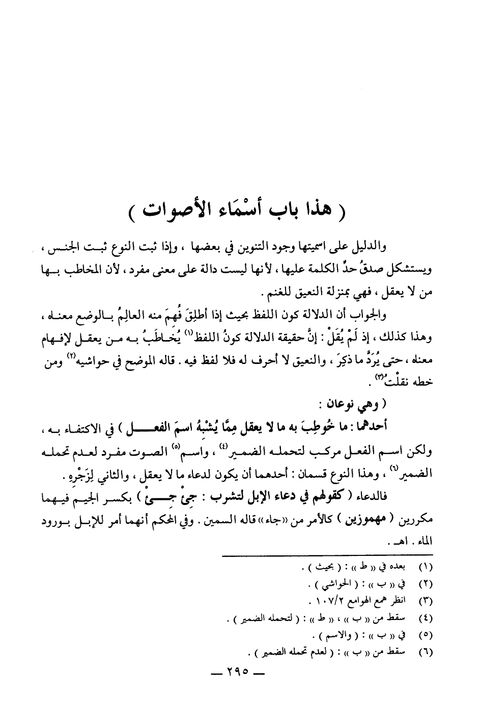 أحدهما: ما خوطب به ما لا يعقل مما يشبه اسم الفعل" في الاكتفاء به، ولكن اسم الفعل مركب لتحمله الضمير4، واسم5 الصوت مفرد لعدم تحمله الضمير6، وهذا النوع قسمان: أحدهما أن يكون لدعاء ما لا يعقل، والثاني لزجره.