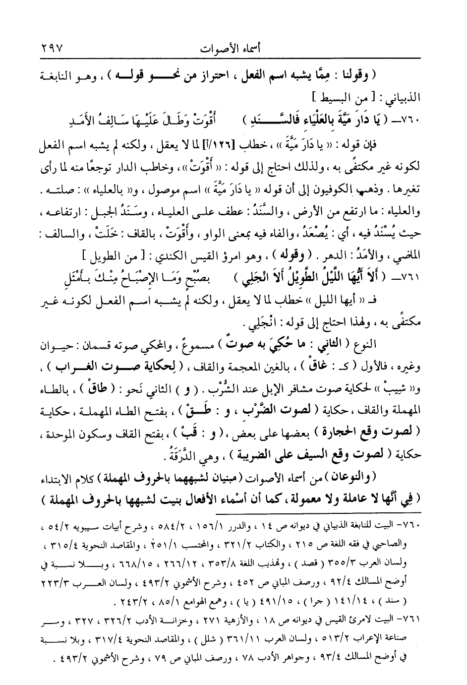 فإن قوله: "يا دار مية"، خطاب لما لا يعقل، ولكنه لم يشبه اسم الفعل لكونه غير مكتفى به، ولذلك احتاج إلى قوله: "أقوت"، وخاطب الدار توجعًا منه لما رأى تغيرها. وذهب الكوفيون إلى أن قوله "يا دار مية" اسم موصول، و"بالعلياء": صلته. والعلياء: ما ارتفع من الأرض، والسند: عطف على العلياء، وسند الجبل: ارتفاعه، حيث يسند فيه، أي: يصعد، والفاء فيه بمعنى الواو، وأقوت، بالقاف، خلت. والسالف: الماضي، والأمد: الدهر. "وقوله"، وهو امرؤ القيس الكندي: [من الطويل]