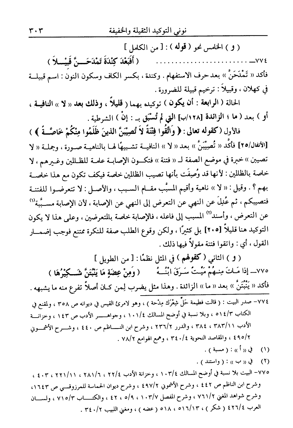 فالأول "كقوله تعالى: {وَاتَّقُوا فِتْنَةً لَا تُصِيبَنَّ الَّذِينَ ظَلَمُوا مِنْكُمْ خَاصَّةً} " [الأنفال: 25] فأكد "تصيبن" بعد "لا" النافية تشبيهًا لها بالناهية صورة، وجملة "لا تصيبن" خبرة في موضع الصفة لـ"فتنة" فتكون الإصابة عامة للظالمين وغيرهم، لا خاصة بالظالمين: لأنها قد وصفت بأنها تصيب الظالمين خاصة فيكف تكون مع هذا خاصة بهم؟. وقيل: "لا" ناهية وأقيم المسبب مقام السبب، والأصل: لا تتعرضوا للفتنة فتصيبكم، ثم عدل عن النهي عن التعرض إلى النهي عن الإصابة، لأن الإصابة مسببة1 عن التعرض، وأسند2 المسبب إلى فاعله، فالإصابة خاصة بالمتعرضين، وعلى هذا لا يكون التوكيد هنا قليلا بل كثيرًا، ولكن وقوع الطلب صفة للنكرة ممتنع فوجب إضمار القول، أي: واتقوا فتنة مقولا فيها ذلك.