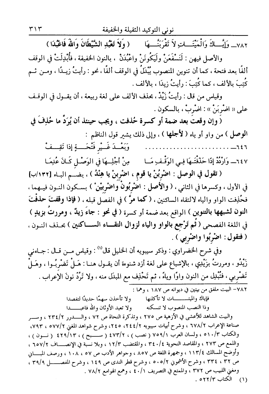 وفي شرح الخضراوي: وذكر سيبويه أن الخليل قال1: وقياس من قال: جاءني زيدو، مررت بزيدي، بالإشباع على لغة أزد شنوءة أن يقول هنا: هل تضربوا، وهل تضربي, فتبدل من النون واوًا وياء، ثم تحذف مع المبدل منه، ولا ترد نون الإعراب.