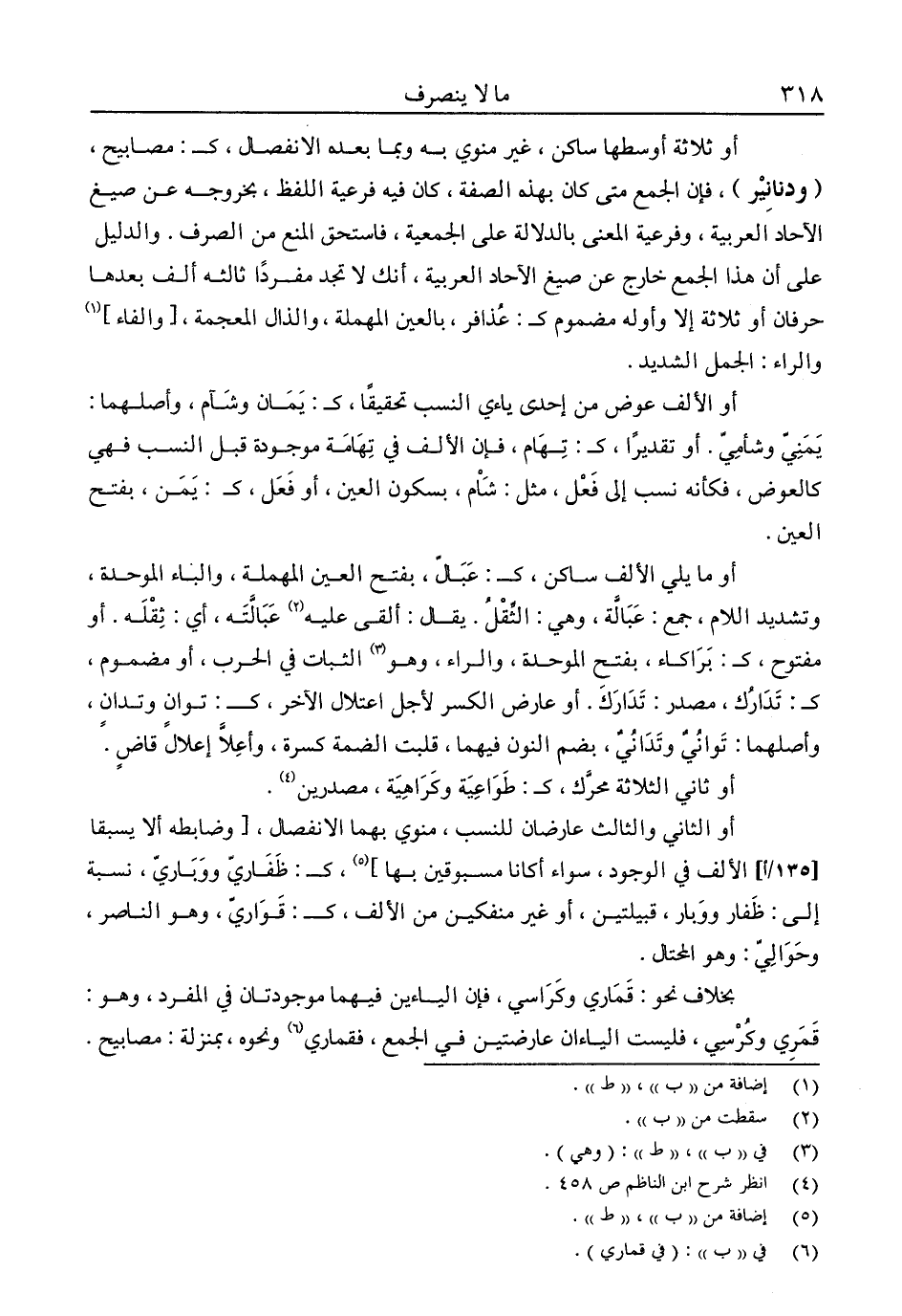 أو الثاني والثالث عارضان للنسب، منوي بهما الانفصال، [وضابطه ألا يسبقا الألف في الوجود، سواء أكانا مسبوقين بها] 5، كـ: ظفاري ووباري، نسبة إلى: ضفار ووبار، قبيلتين، أو غير منفكين من الألف، كـ: قواري، وهو الناصر وحوالي: وهو المحتال.