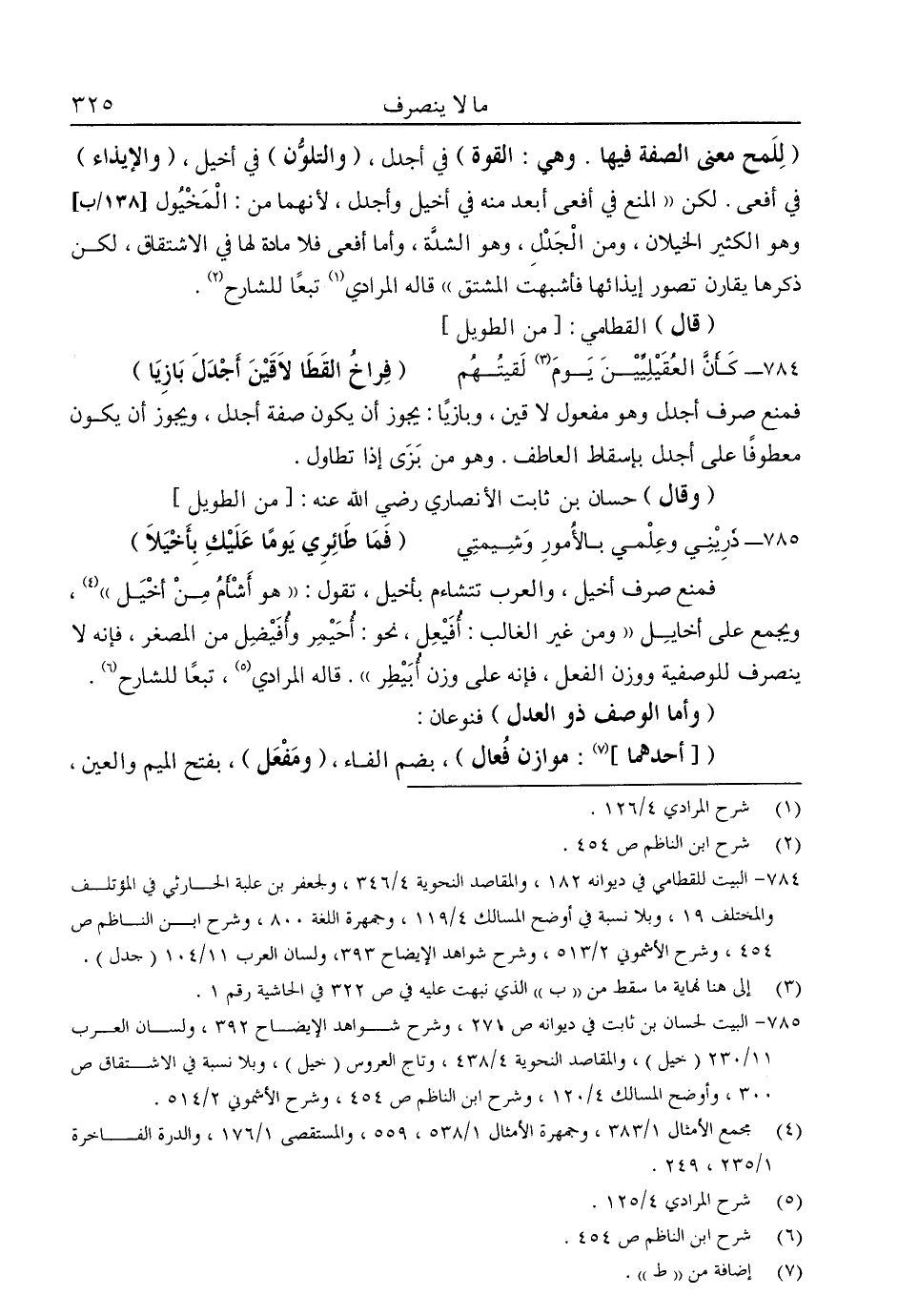 فمنع صرف أخيل، والعرب تتشاءم بأخيل، تقول: "هو أشأم من أخيل"4، ويجمع على أخايل "ومن غير الغالب: أفيعل، نحو: أحيمر وأفيضل من المصغر، فإنه لا ينصرف للوصفية ووزن الفعل، فإنه على وزن أبيطر". قاله المرادي5، تبعًا للشارح6.
