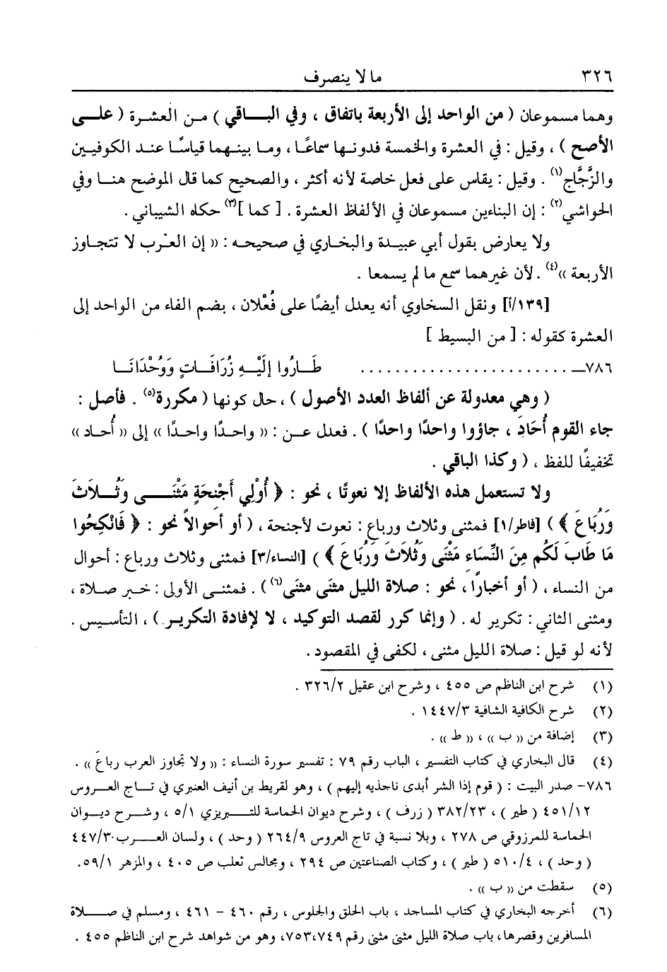 6 أخرجه البخاري في كتاب المساجد باب الحلق والجلوس، رقم460-461، ومسلم في صلاة المسافرين وقصرها، باب صلاة الليل مثنى مثنى رقم 749، 753، وهو من شواهد شرح ابن الناظم ص455.