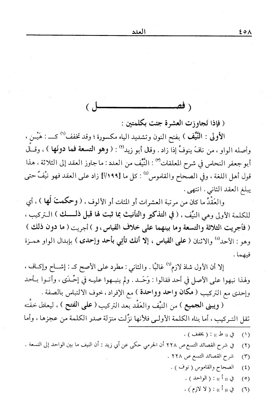 الأولى: النيف" بفتح النون وتشديد الياء مكسورة؛ وقد تخفف1 كـ: هين، وأصله الواو، من ناف ينوف إذا زاد. وقال أبو زيد2: "وهو التسعة فما دونها"، وقال أبو جعفر النحاس في شرح المعلقات3: النيف من العدد: ما جاوز العقد إلى الثلاثة. هذا قول أهل اللغة، وفي الصحاح والقاموس4: كل ما زاد على العقد فهو نيف حتى يبلغ العقد الثاني. انتهى.