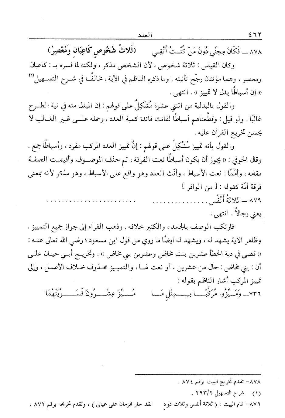 "قضى في دية الخطأ عشرين بنت مخاض وعشرين بني مخاض" وتخريج أبي حيان على أن: بني مخاض: حال من عشرين، أو نعت لها، والتمييز محذوف خلاف الأصل، وإلى تمييز المركب أشار الناظم بقوله: