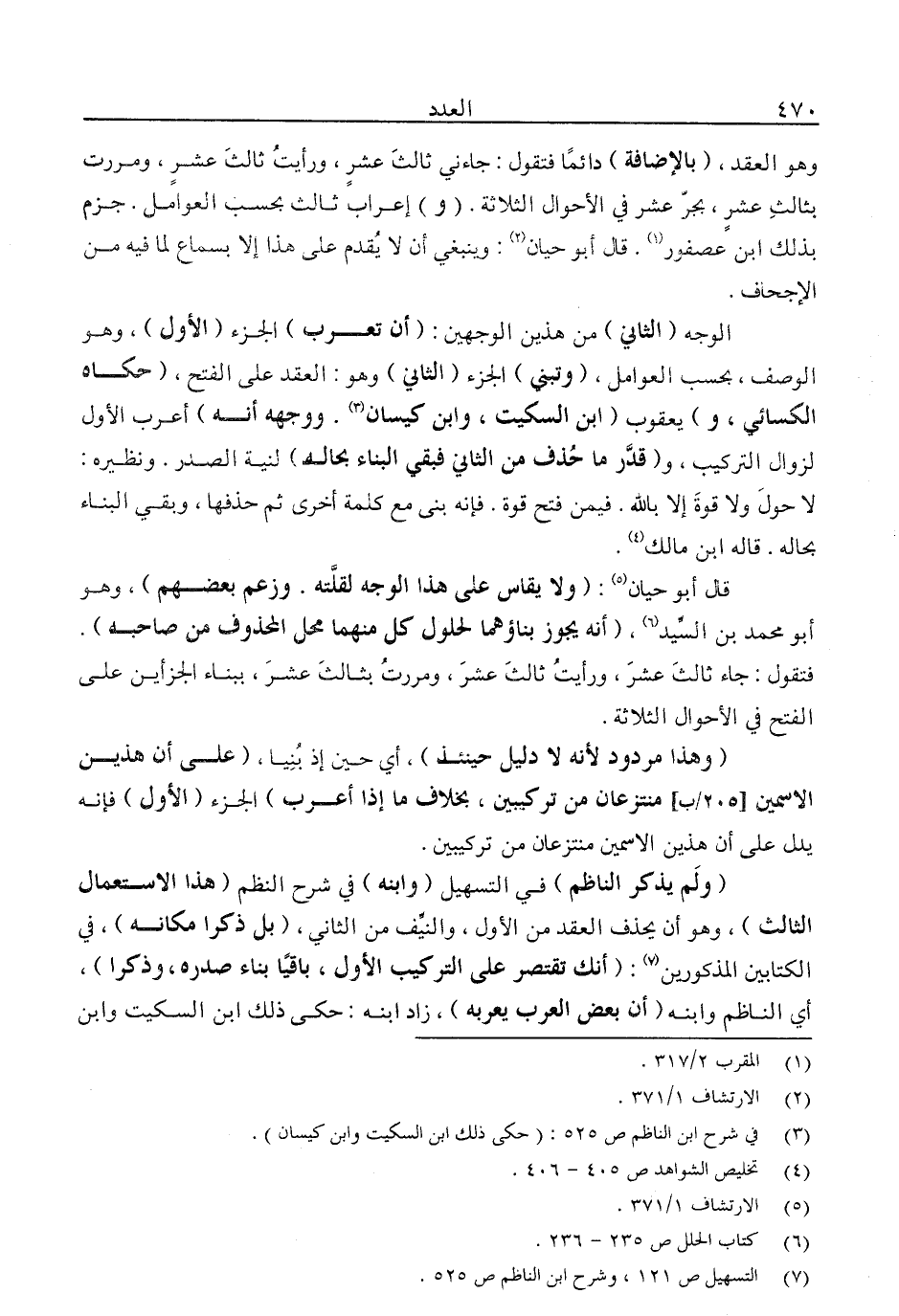 "ولم يذكر الناظم" في التسهيل "وابنه" في شرح النظم "هذا الاستعمال الثالث"، وهو أن يحذف العقد من الأول، والنيف من الثاني، "بل ذكرا مكانه"، في الكتابين المذكورين7: "أنك تقتصر على التركيب الأول، باقيًا بناء صدره، وذكرا"، أي الناظم وابنه "أن بعض العرب يعربه" زاد ابنه: حكى ذلك ابن السكيت وابن