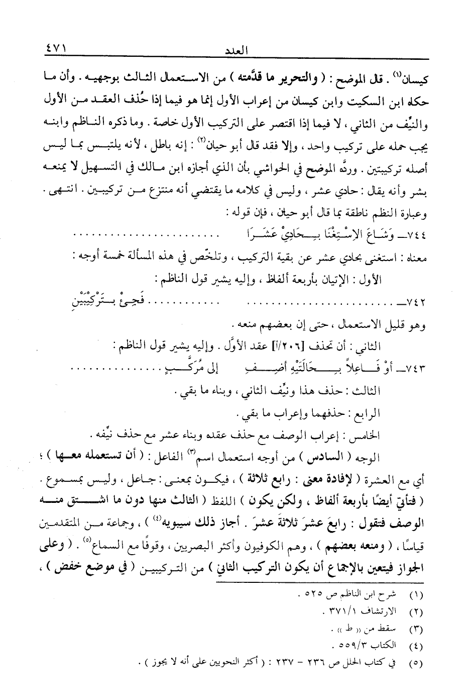 كيسان1. قال الموضح: "والتحرير ما قدمته" من الاستعمال الثالث بوجهيه. وأن ما حكاه ابن السكيت وابن كيسان من إعراب الأول إنما هو فيما إذا حذف العقد من الأول والنيف من الثاني، لا فيما إذا اقتصر على التركيب الأول خاصة. وما ذكره الناظم وابنه يجب حمله على تركيب واحد، وإلا فقد قال أبو حيان2: إنه باطل، لأنه يلتبس بما ليس أصله تركيبتين. ورده الموضح في الحواشي بأن الذي أجازه ابن مالك في التسهيل لا يمنعه بشر وأنه يقال: حادي عشر، وليس في كلامه ما يقتضي أنه منتزع من تركيبين: انتهى. وعبارة النظم ناطقة بما قال أبو حيان: فإن قوله: