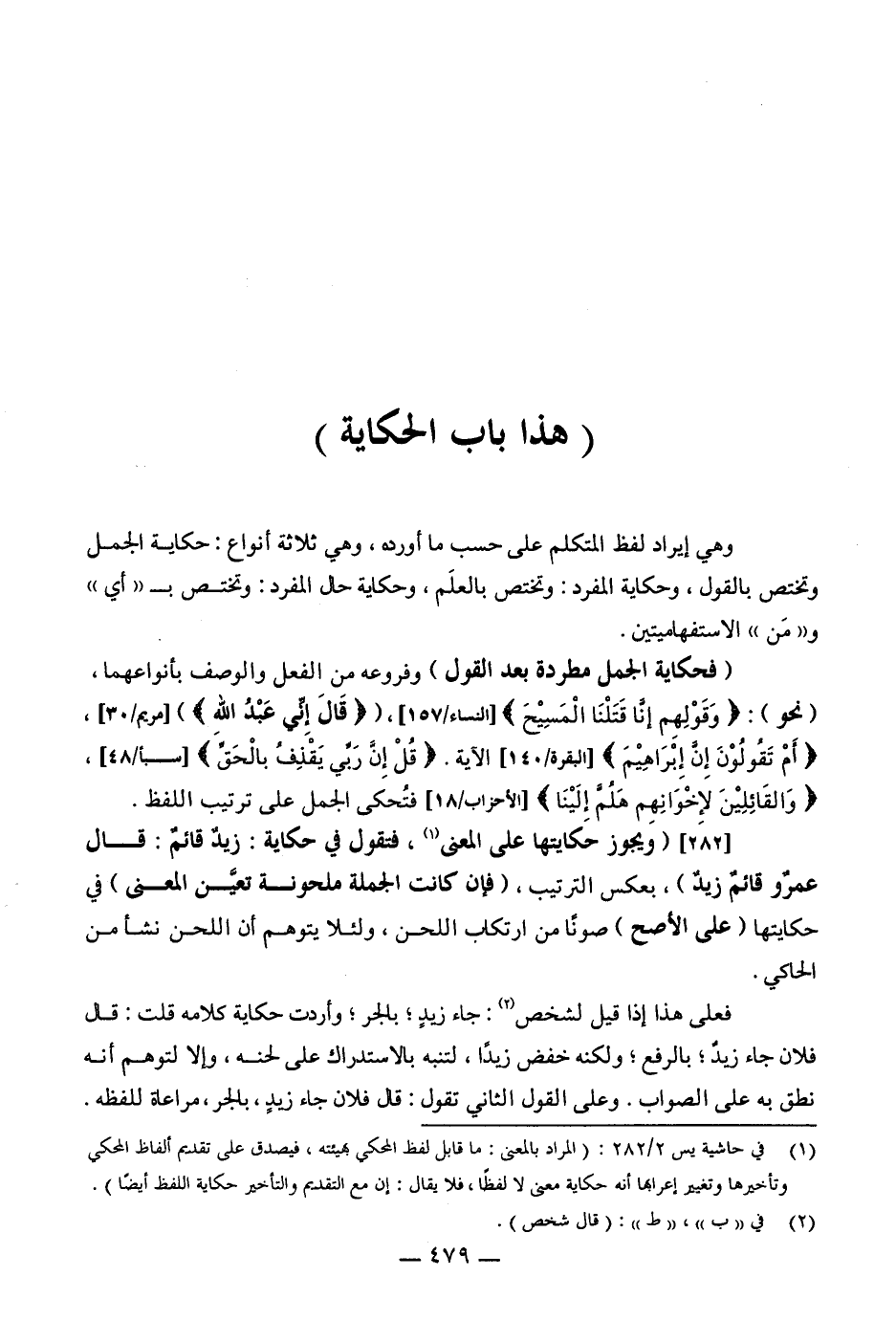 فعلى هذا إذا قيل لشخص2: جاء زيد؛ بالجر؛ وأردت حكاية كلامه قلت: قال فلان جاء زيد؛ بالرفع؛ ولكنه خفض زيدًا، لتنبه بالاستدراك على لحنه، وإلا لتوهم أنه نطق به على الصواب. وعلى القول الثاني تقول: قال فلان جاء زيد بالجر، مراعاة للفظه.