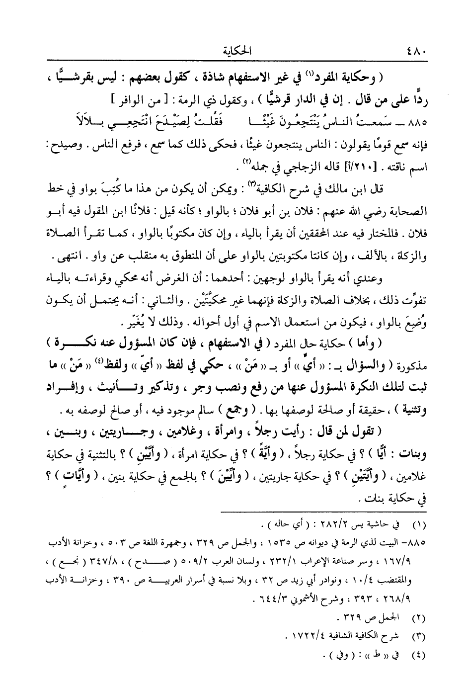 "وحكاية المفرد1 في غير الاستفهام شاذة، كقول بعضهم: ليس بقرشيًّا، ردًّا على من قال: إن في الدار قريشًا" وكقول ذي الرمة: [من الوافر]