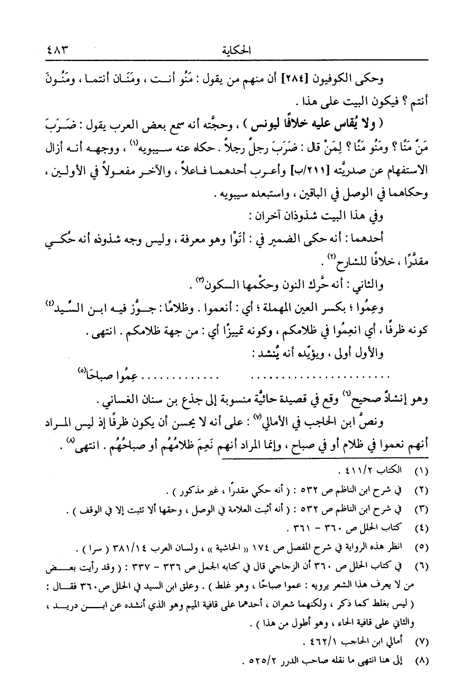 6 في كتاب الحلل ص360 أن الزجاجي قال في كتابه الجمل ص336-337: "وقد رأيت بعض من لا يعرف هذا الشعر يرويه: عموا صباحًا, وهو غلط". وعلق ابن السيد في الحلل ص360 فقال: "ليس بغلط كما ذكر، ولكنهما شعران، أحدهما على قافية الميم وهو الذي أنشده عن ابن دريد، والثاني على قافية الحاء، وهو أطول من هذا".