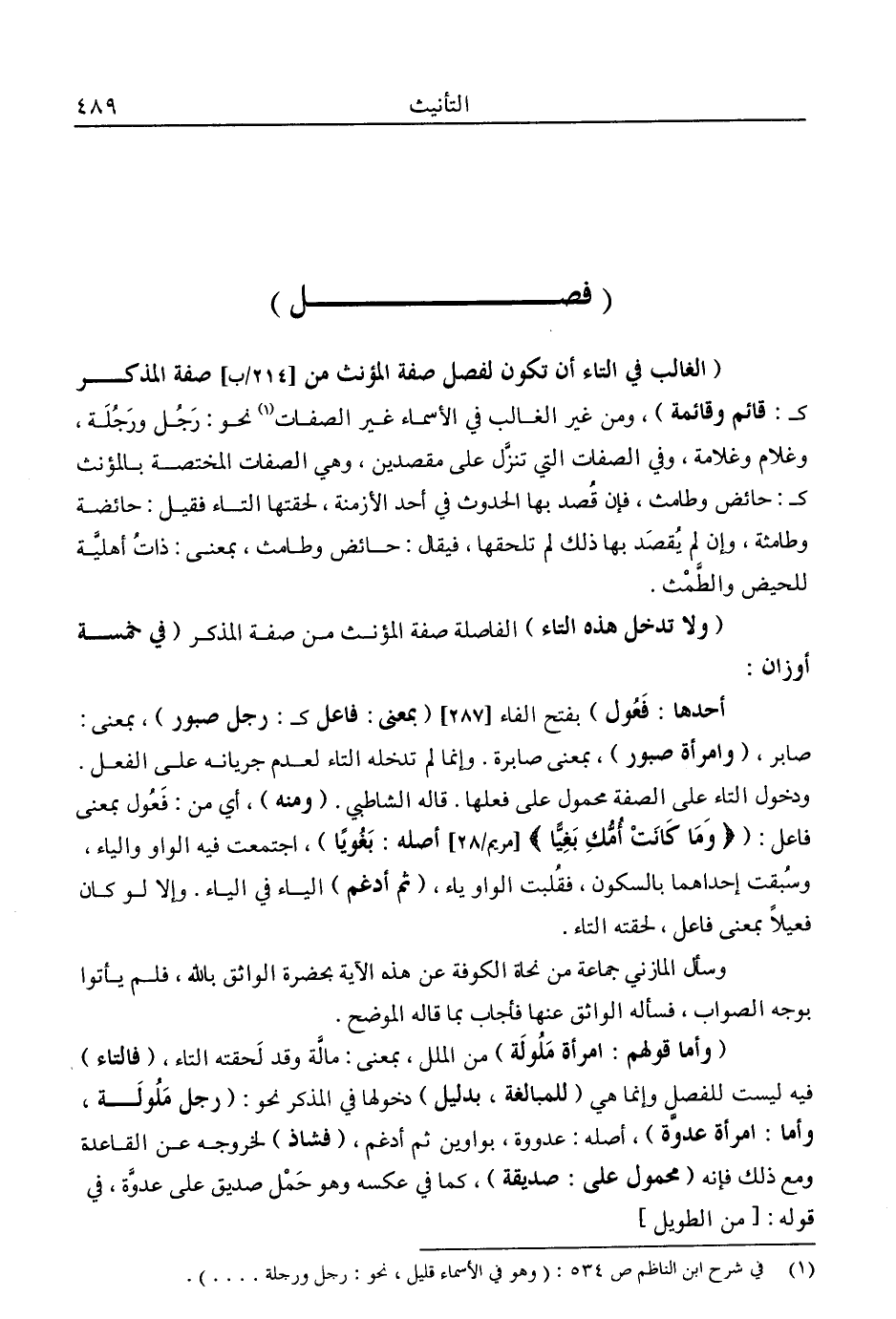 "الغالب في التاء أن تكون لفصل صفة المؤنث من صفة المذكر كـ: قائم وقائمة"، ومن غير الغالب في الأسماء غير الصفات1 نحو: رجل ورجلة، وغلام وغلامة، وفي الصفات التي تنزل على مقصدين، وهي الصفات المختصة بالمؤنث كـ: حائض وطامث، فإن قصد بها الحدوث في أحد الأزمنة، لحقتها التاء فقيل: حائضة وطامثة. وإن لم يقصد بها ذلك لم تلحقها، فيقال: حائض وطامث، بمعنى: ذات أهلية للحيض والطمث.