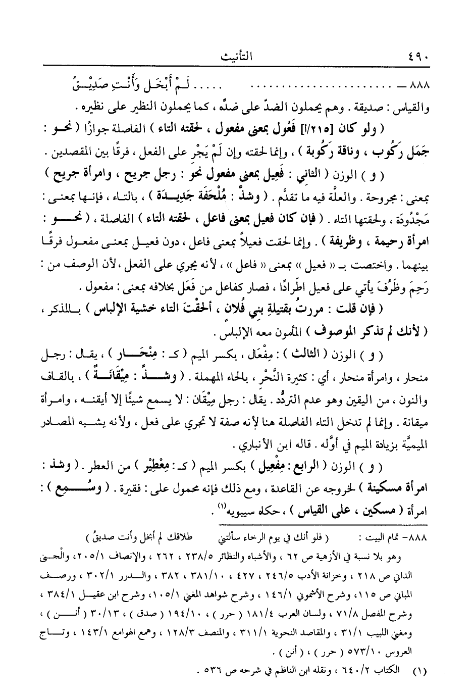 "و" الوزن "الرابع: مِفْعِيل" بكسر الميم "كـ: معطير" من العطر، "وشذ: امرأة مسكينة" لخروجه عن القاعدة، ومع ذلك فإنه محمول على: فقيرة. "وسمع": امراة "مسكين, على القياس" حكاه سيبويه1.