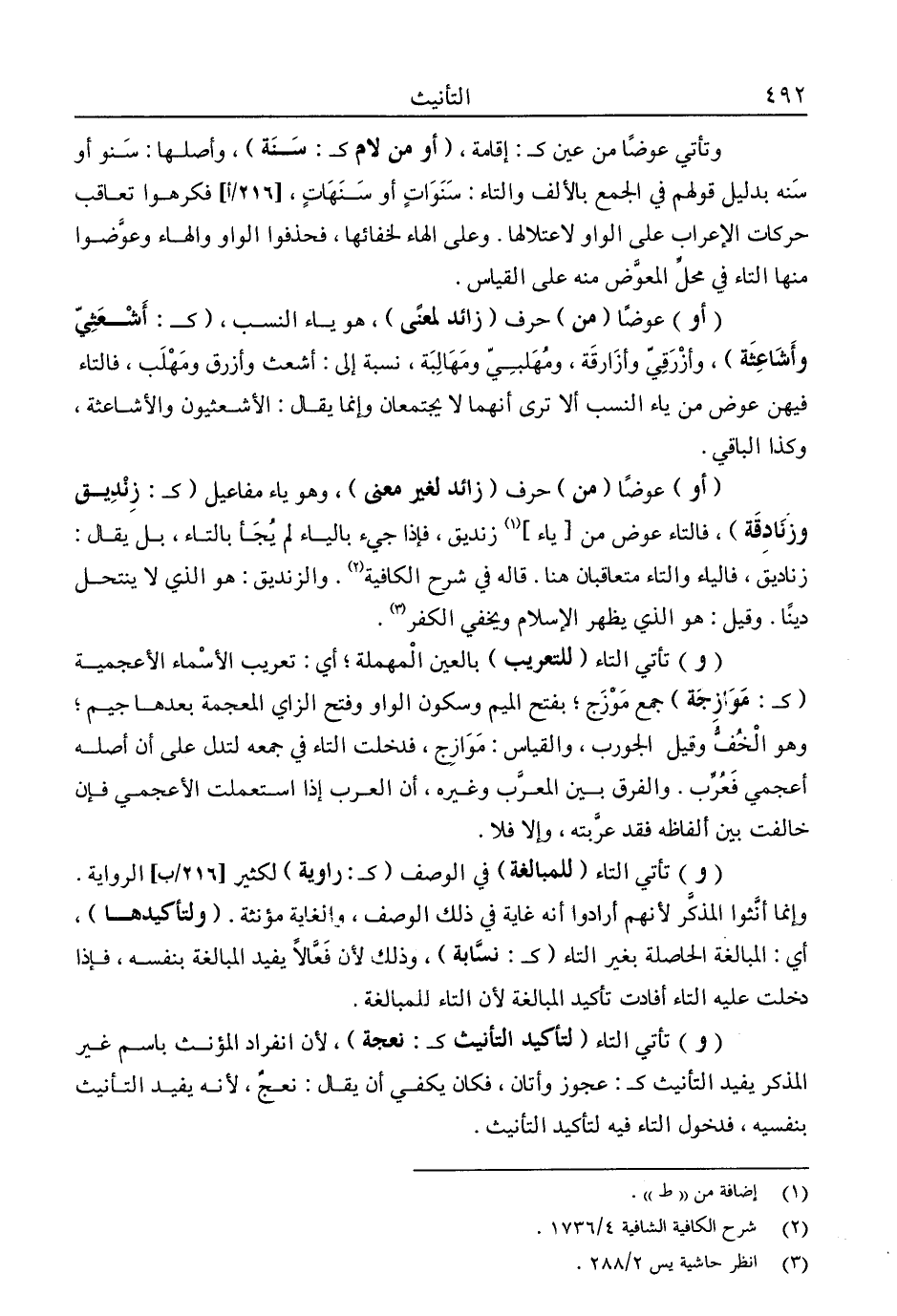 وتأتي عوضًا من عين كـ: إقامة، "أو من لام كـ: سنة"، وأصلها: سنو أو سنه بدليل قولهم في الجميع بالألف والتاء: سنوات أو سنهات، فكرهوا تعاقب حركات الإعراب على الواو لاعتلالها. وعلى الهاء لخفائها، فحذفوا الواو والهاء وعوضوا منها التاء في محل المعوض منه على القياس.