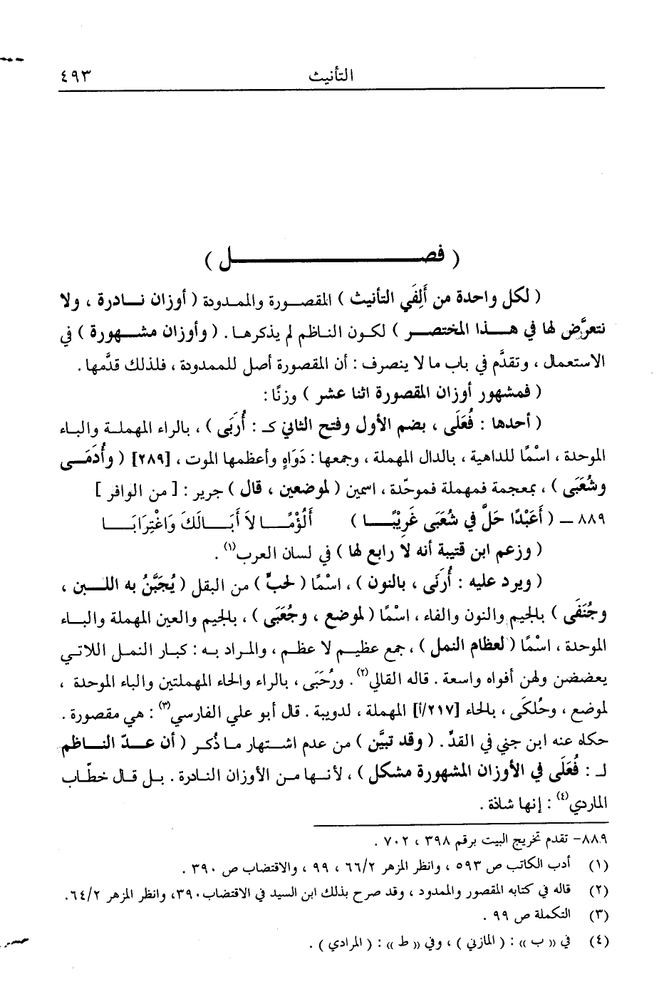 "ويرد عليه: أرنى، بالنون"، اسمًا "لحب" من البقل "يجبن به اللبن وجنفى" بالجيم والنون والفاء، اسمًا "لموضع، وجعبى"، بالجيم والعين المهملة والباء الموحدة، اسمًا "لعظام النمل" جمع عظيم لا عظم، والمراد به: كبار النمل اللاتي يعضضن ولهن أفواه واسعة. قاله القالي2. ورحبى، بالراء والحاء المهملتين والباء الموحدة، لموضع، وحلكى، بالحاء المهملة، لدويبة، قال أبو علي الفارسي3: هي مقصورة. حكاه عنه ابن جني في القد. "وقد تبين" من عدم اشتهار ما ذكر "أن عد الناظم لـ: فعلى في الأوزان المشهورة مشكل"، لأنها من الأوزان النادرة، بل قال خطاب الماردي4: إنها شاذة.