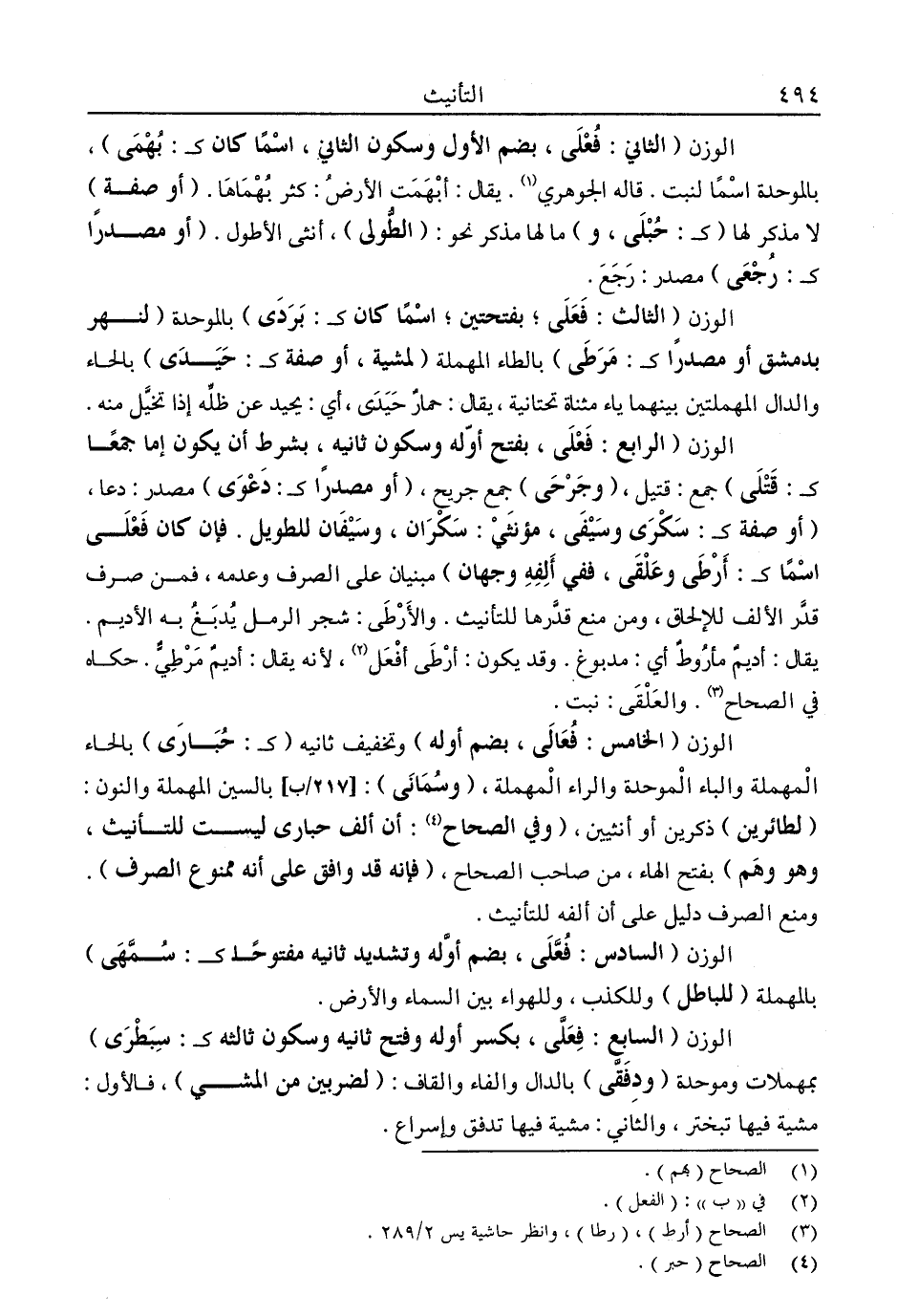 الوزن "الرابع: فَعْلَى، بفتح أوله وسكون ثانيه، بشرط أن يكون إما جمعًا كـ: قتلى" جمع: قتيل، "وجرحى" جمع جريح، "أو مصدرًا كـ: دعوى" مصدر: دعا، "أو صفة كـ: سكرى وسيفى، مؤنثي: سكران، وسيفان للطويل، فإن كان فعلى اسمًا كـ: أرطى وعلقى، ففي ألفه وجهان" مبنيان على الصرف وعدمه، فمن صرف قدر الألف للإلحاق، ومن منع قدرها للتأنيث، والأرطى: شجر الرمل يدبغ به الأديم. يقال: أديم مأروط أي: مدبوغ. وقد يكون: أرطى أفعل2، لأنه يقال: أديم مرطي، حكاه في الصحاح3، والعلقى: نبت.