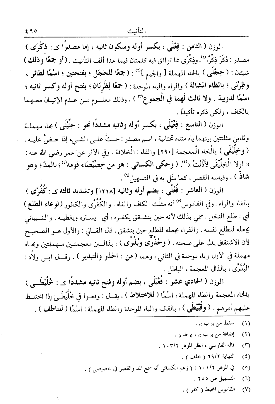 الوزن "العاشر: فعلى، بضم أوله وثانيه وتشديد ثالثه كـ: كفرى" بالفاء والراء. وفي القاموس7 أنه مثلث الكاف والفاء. والكفرى والكافور "لوعاء الطلع" أي: طلع النخل. سمي بذلك لأنه حين يتشقق يكفره، أي: يستره ويغطيه، والشيباني يجعله للطلع نفسه. والفراء يجعله للطلع حين يتشقق. قال القالي: والأول هو الصحيح لأن الاشتقاق يدل على صحته. "وحذرى وبذرى"، بذالين معجمتين مهملتين وبحاء مهملة في الأول وباء موحدة في الثاني: وهما "من: الحذر والتبذير". وقال ابن ولاد: البذرى. قالذال المعجمة، الباطل.
