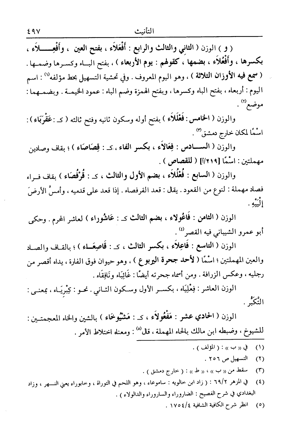 والوزن، "الخامس: فعللاء" بفتح أوله وسكون ثانيه وفتح ثالثه "كـ: عقرباء": اسما لمكان خارج دمشق3.