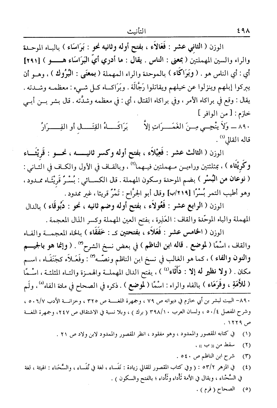 الوزن "الثاني عشر: فَعَالاء، بفتح أوله وثانيه نحو: بَرَاساء" بالباء الموحدة والراء والسين المهملتين "بمعنى: الناس. يقال: ما أدري أي البراساء هو" أي: أي الناس هو. "وبراكاء" بالموحدة والراء المهملة "بمعنى: البروك"، وهو أن يبركوا إبلهم وينزلوا عن خيلهم ويقاتلوا رجالة. وبراكاء كل شيء: معظمه وشدته. يقال: وقع في براكاء الأمر، وفي براكاء القتال، أي: في معظمه وشدته. قال بشر بن أبي خازم: [من الوافر]