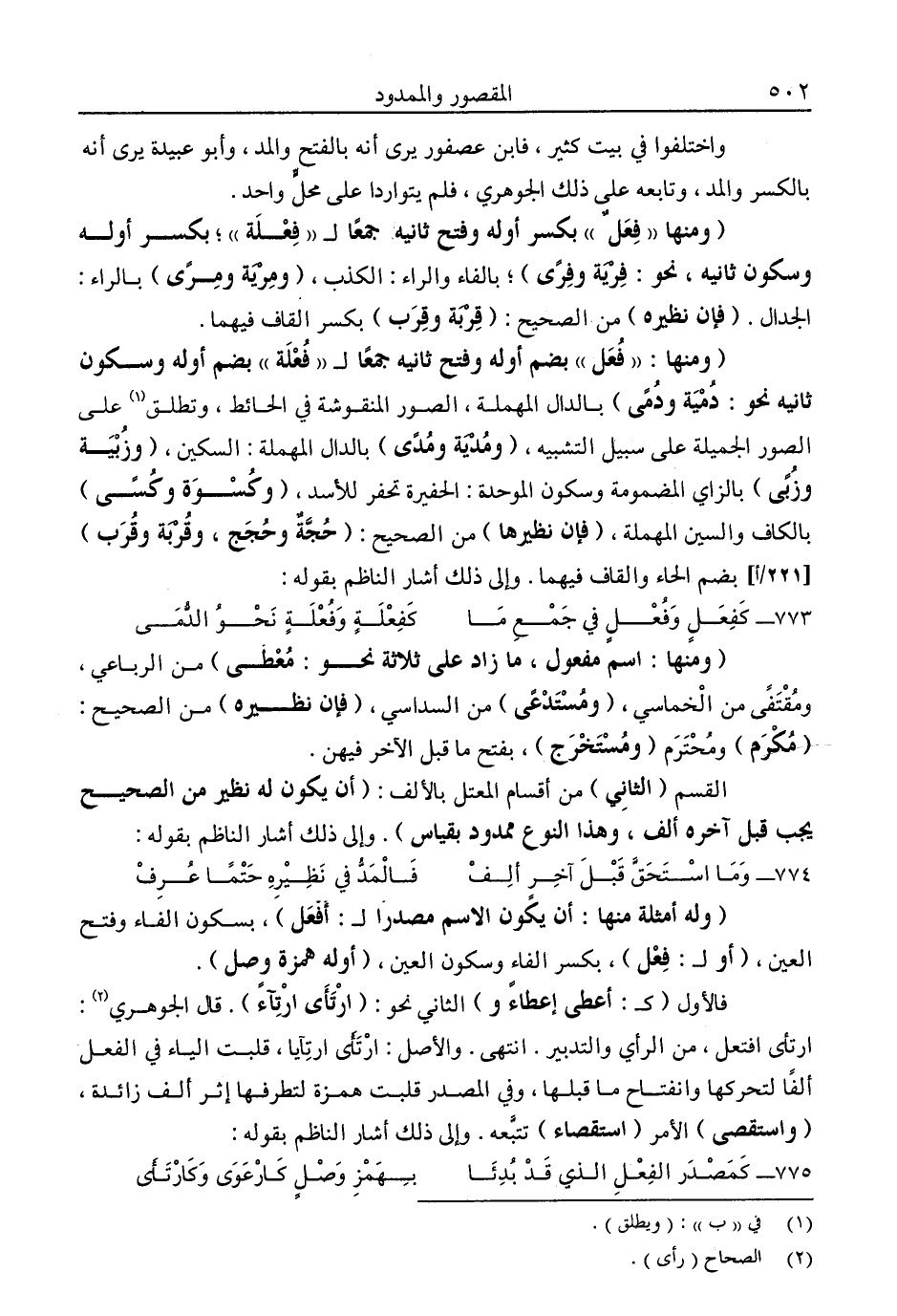 القسم "الثاني" من أقسام المعتل بالألف: "أن يكون له نظير من الصحيح يجب قبل آخره ألف، وهو النوع ممدود بقياس". وإلى ذلك أشار الناظم بقوله: