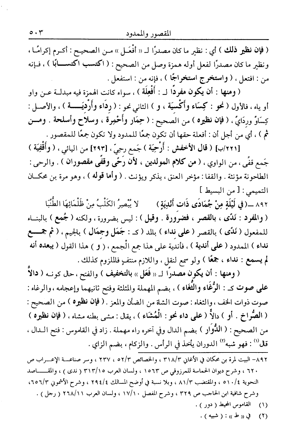 "والمفرد: ندى، بالقصر، فضرورة. وقيل": ليس بضرورة ولكنه "جمع" بالبناء للمفعول "ندى" بالقصر "على نداء" بالمد "كـ: جمل وجمال" بالجيم، "ثم جمع نداء" الممدود "على أندية"، فأندية على هذا جمع الجمع. "و" هذا القول "يبعده أنه لم يسمع. نداء جمعًا" ولو سمع لنقل، واللازم منتف فالملزوم كذلك.