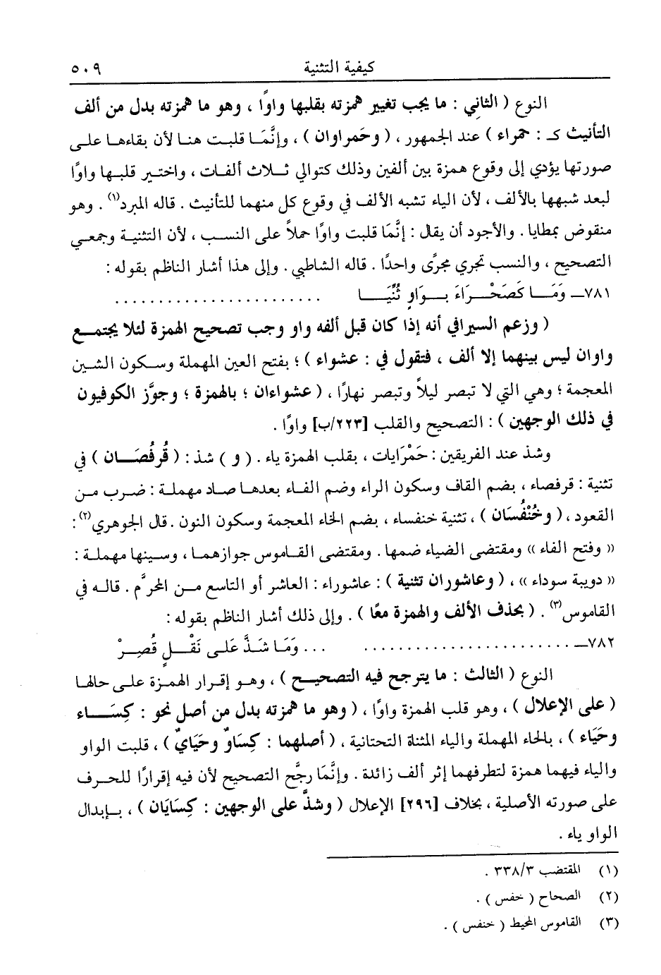 وشذ عند الفريقين: حمرايات، بقلب الهمزة ياء. "و" شذ: "قرفصان" في تثنية: قرفصاء، بضم القاف وسكون الراء وضم الفاء بعدها صاد مهملة: ضرب من القعود. "وخنفسان"، تثنية خنفساء، بضم الخاء المعجمة وسكون النون. قال الجوهري2: "وفتح الفاء" ومقتضى الضياء ضمها، ومقتضى القاموس جوازهما، وسينها مهملة: