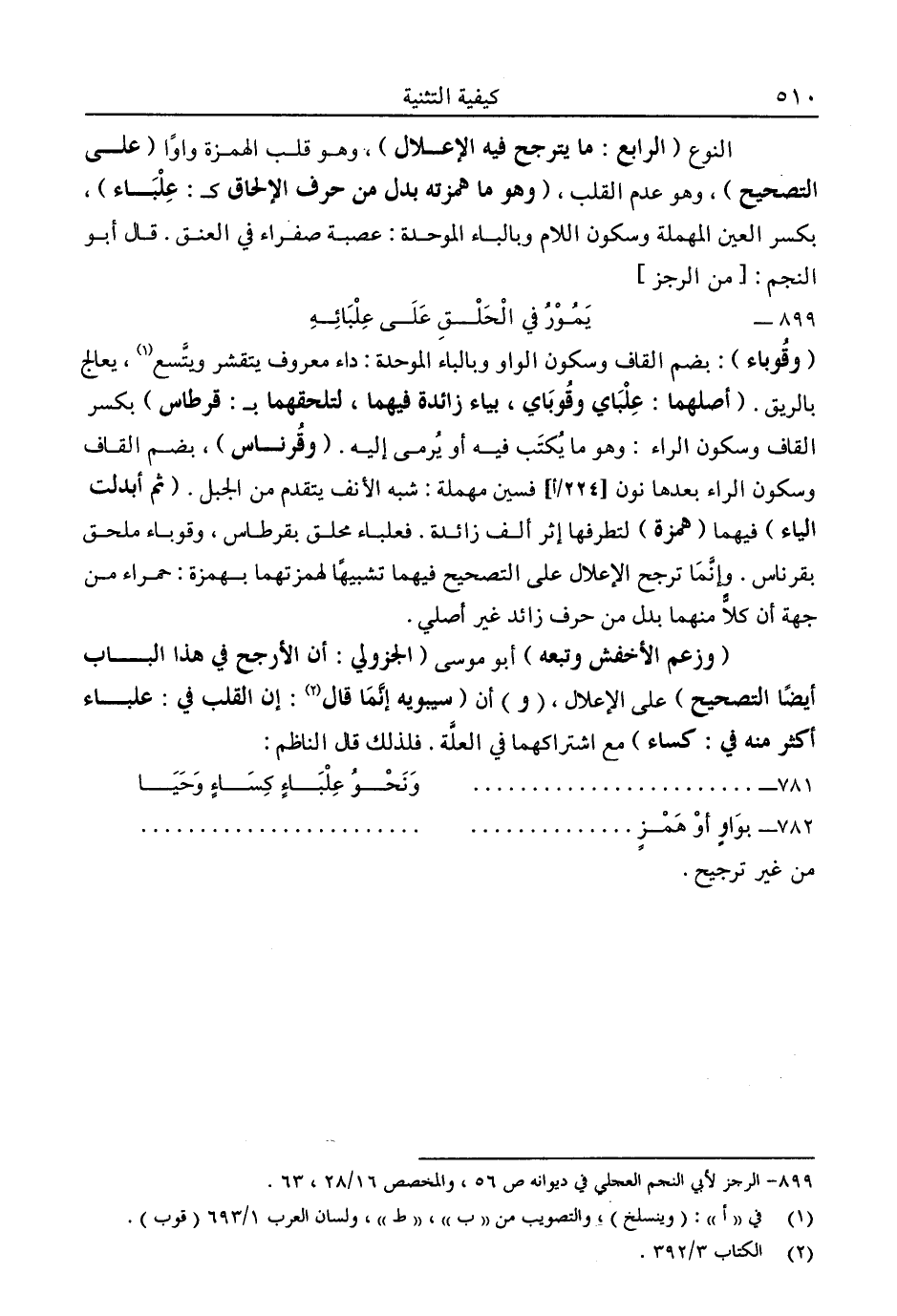 "وقوباء": بضم القاف وسكون الواو وبالباء الموحدة: داء معروف يتقشر ويتسع1، يعالج بالريق. "أصلهما: علباي وقوباي، بياء زائدة فيهما، لتلحقهما بـ: "قرطاس" بكسر القاف وسكون الراء: وهو ما يكتب فيه أو يرمى إليه. "وقرناس"، بضم القاف وسكون الراء بعدها نون فسين مهملة: شبه الأنف يتقدم من الجبل. "ثم أبدلت الياء" فيهما "همزة" لتطرفها إثر ألف زائدة. فعلباء ملحق بقرطاس، وقوباء ملحق بقرناس. وإنما ترجح الإعلال على التصحيح فيهما تشبيهًا لهمزتها بهمزة: حمراء من جهة أن كلا منهما بدل من حرف زائد غير أصلي.