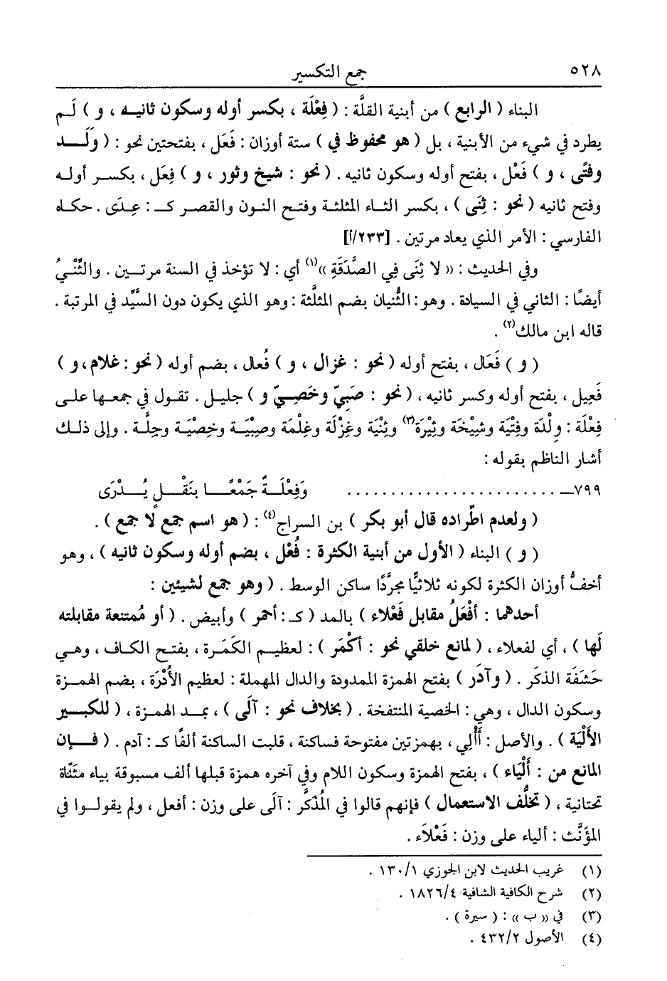 البناء "الرابع" من أبنية القلة: "فعلة، بكسر أوله وسكون ثانيه، و" لم يطرد في شيء من الأبنية. بل "هو محفوظ في" ستة أوزان: فعل، بفتحتين نحو: "ولد وفتى، و" فعل، بفتح أوله وسكون ثانيه. "نحو: شيخ وثور، و" فعل، بكسر أوله وفتح ثانيه "نحو: ثنى" بكسر الثاء المثلثة وفتح النون والقصر كـ: عدى. حكاه الفارسي: الأمر الذي يعاد مرتين.