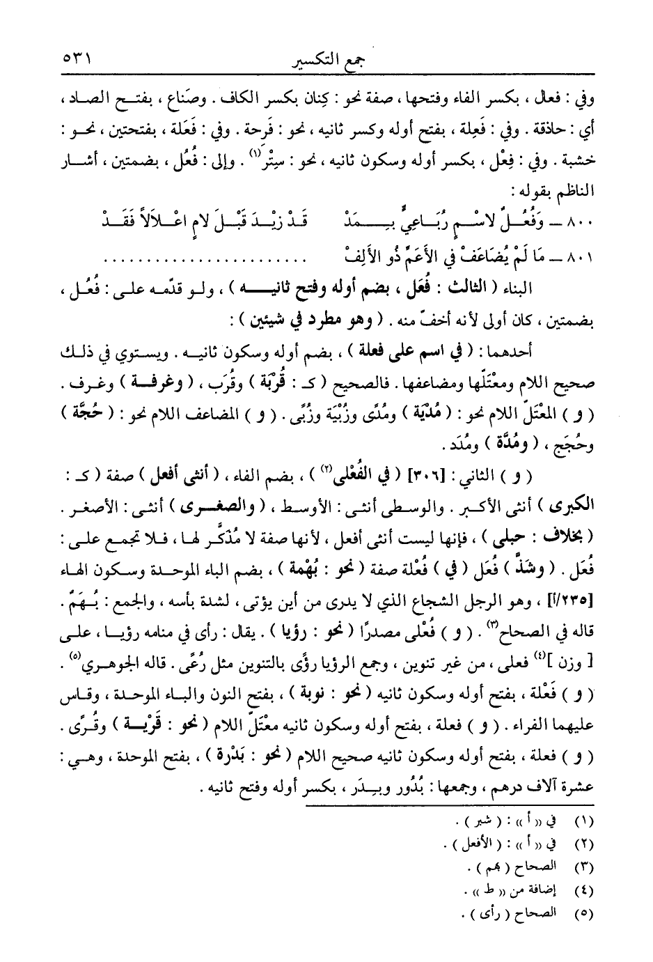 "و" الثاني: "في الفعلى2"، بضم الفاء، "أنثى أفعل" صفة "كـ: الكبرى" أنثى الأكبر، والوسطى أنثى: الأوسط، "والصغرى" أنثى: الأصغر. "بخلاف: حبلى"، فإنها ليست أنثى أفعل، لأنها صفة لا مذكر لها، فلا تجمع على: فعل. "وشذ" فعل "في" فعلة صفة "نحو: بهمة"، بضم الباء الموحة وسكون الهاء وهو الرجل الشجاع الذي لا يدرى من أين يؤتى، لشدة بأسه، والجمع: بهم. قاله في الصحاح3. "و" فعلى مصدرًا "نحو: رؤيا". يقال: رأى في منامه رؤيا. على [وزن] 4 فعلى، من غير تنوين، وجمع الرؤيا رؤى بالتنوين مثل رعى. قاله الجوهري5. "و" فعلة، بفتح أوله وسكون ثانيه "نحو: نوبة" بفتح النون والباء الموحدة وقاس، عليهما الفراء. "و" فعلة، بفتح أوله وسكون ثانيه معتل اللام "نحو: قرية" وقرى. "و" فعلة، بفتح أوله وسكون ثانيه صحيح اللام "نحو: بدرة"، بفتح الموحدة، وهي: عشرة آلاف درهم، وجمعها: بدور وبدر، بكسر أوله وفتح ثانيه.