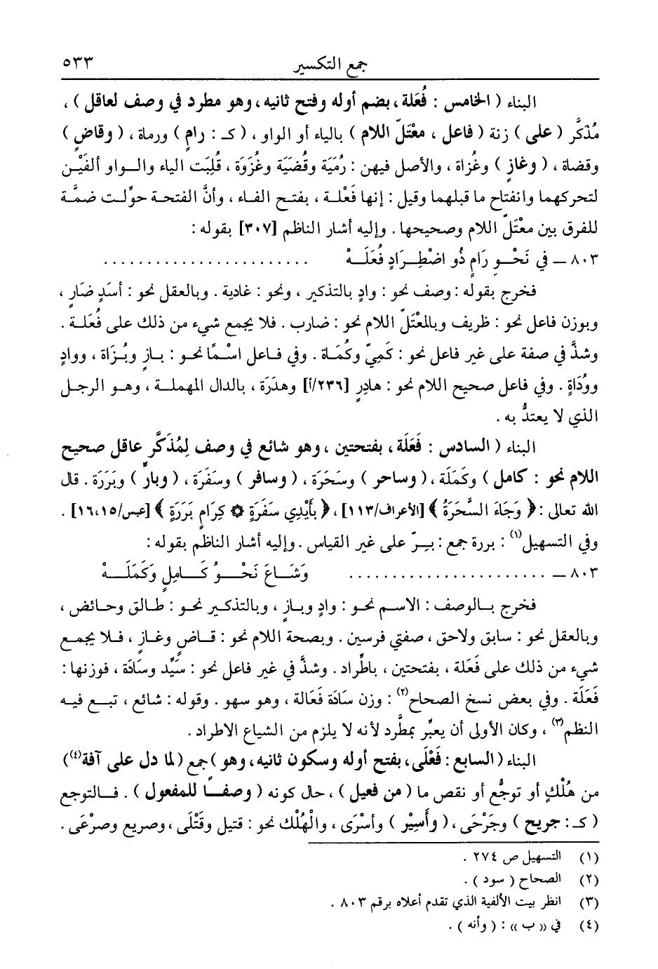 البناء "السادس: فعلة، بفتحتين، وهو شائع في وصف لمذكر عاقل صحيح اللام نحو: كامل" وكملة، "وساحر" وسحرة، "وسافر" وسفرة، "وبار" وبررة. قال الله تعالى: {وَجَاءَ السَّحَرَةُ} [الأعراف: 113] {بِأَيْدِي سَفَرَةٍ، كِرَامٍ بَرَرَةٍ} [عبس: 15، 16] وفي التسهيل1: بررة جمع: بر على غير القياس. وإليه أشار الناظم بقوله: