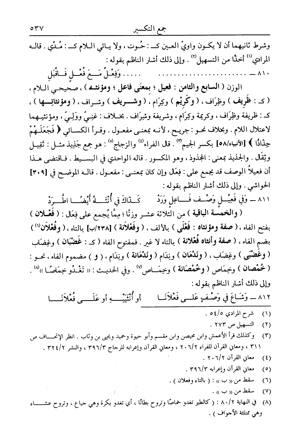 الوزن "السابع والثامن: فعيل؛ بمعنى فاعل؛ ومؤنثه"، صحيحي اللام، "كـ: ظريف" وظراف، "وكريم" وكرام، "وشريف" وشراف. "ومؤنثاتها"، كـ: ظريفة وظراف، وكريمة وكرام، وشريفة وشراف. بخلاف: غني وولي، ومؤنثيهما لاعتلال اللام. وبخلاف نحو: جريح، لأنه بمعنى مفعول. وقرأ الكسائي "فَجَعَلَهُمْ جِذَاذًا" [الأنبياء: 85] بكسر الجيم3. قال الفراء4 والزجاج5: هو جمع جذيذ مثل: ثقيل وثقال. والجذيذ بمعنى: المجذوذ. وهو المكسور. قال الواحدي في البسيط. فاقتضى هذا أن فعيلا الوصف قد يجمع على: فعال وإن كان بمعنى: مفعول. قاله الموضح في الحواشي. وإلى ذلك أشار الناظم بقوله: