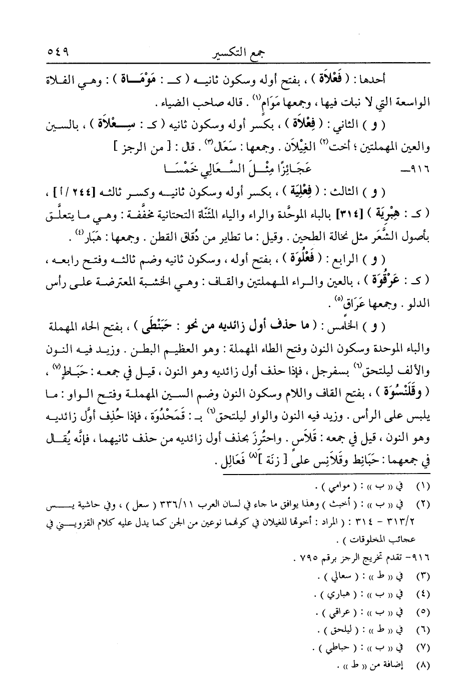 "و"الخامس: "ما حذف أول زائديه من نحو: حبنطى"، بفتح الحاء المهملة والباء الموحدة وسكون النون وفتح الطاء المهملة: وهو العظيم البطن. وزيد فيه النون والألف ليلتحق6 بسفرجل فإذا حذف أول زائديه وهو النون، قيل في جمعه: حباط7، "وقلنسوة"، بفتح القاف واللام وسكون النون وضم السين المهملة وفتح الواو: ما يلبس على الرأس. وزيد فيه النون والواو ليلتحق6 بـ: قمحدوة، فإذا حذف أول زائديه وهو النون قيل في جمعه: قلاس. واحترز بحذف أول زائديه من حذف ثانيهما، فإنه يقال: في جمعهما: حبائط وقلانس على [زنة] 8 فعالل.