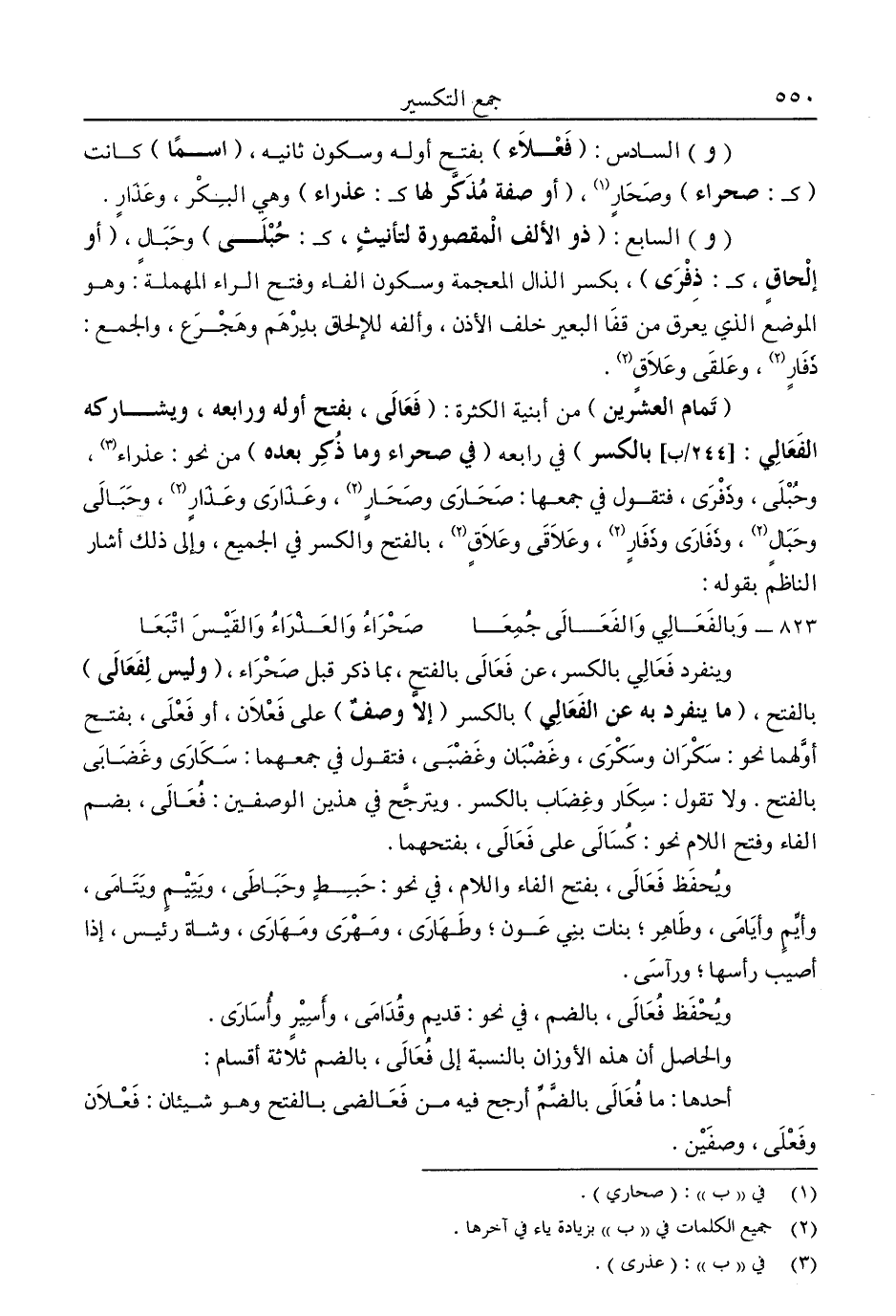 "تمام العشرين" من أبنية الكثرة: "فَعَالَى، بفتح أوله ورابعه، ويشاركه الفعالِي: بالكسر" في رابعه "في صحراء وما ذكر بعده" من نحو: عذراء3، وحبلى، وذفرى، فتقول في جمعها: صحارى وصحار2، وعذارى وعذار2، وحبالى وحبال2، وذفارى وذفار2، وعلاقى وعلاق2، بالفتح والكسر في الجميع، وإلى ذلك أشار الناظم بقوله: