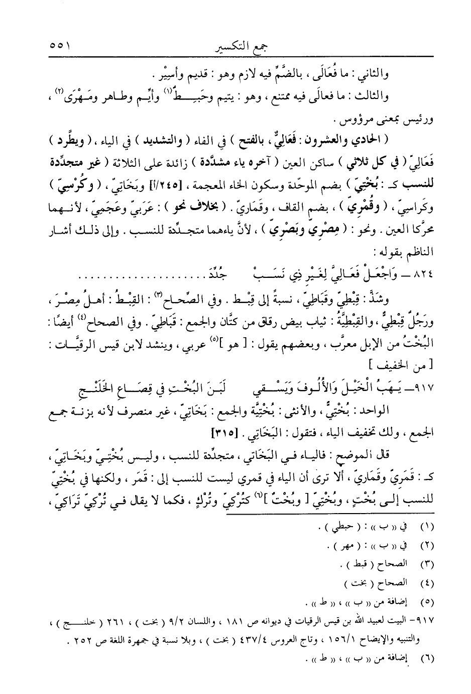وشذ: قبطي وقباطي، نسبة إلى قبط، وفي الصحاح3: القبط: أهل مصر، ورجل قبطي، والقبطية: ثياب بيض رقاق من كتان والجمع: قباطي. وفي الصحاح4 أيضًا: البخت من الإبل معرب، وبعضهم يقول: [هو] 5 عربي، وينشد لابن قيس الرقيات [من الخفيف] .